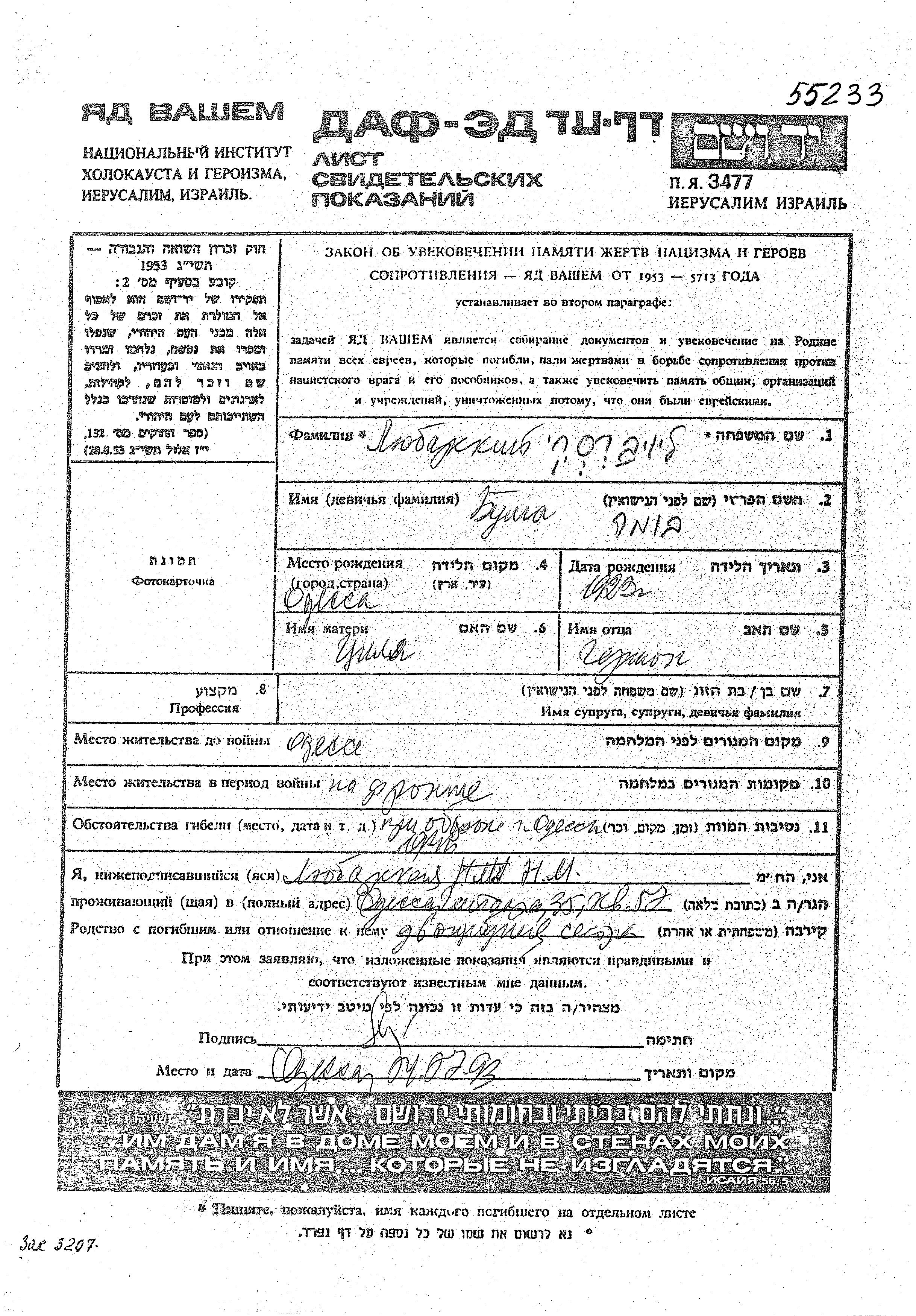 Яд Вашем - Листы свидетельских показаний Мемориального фонда