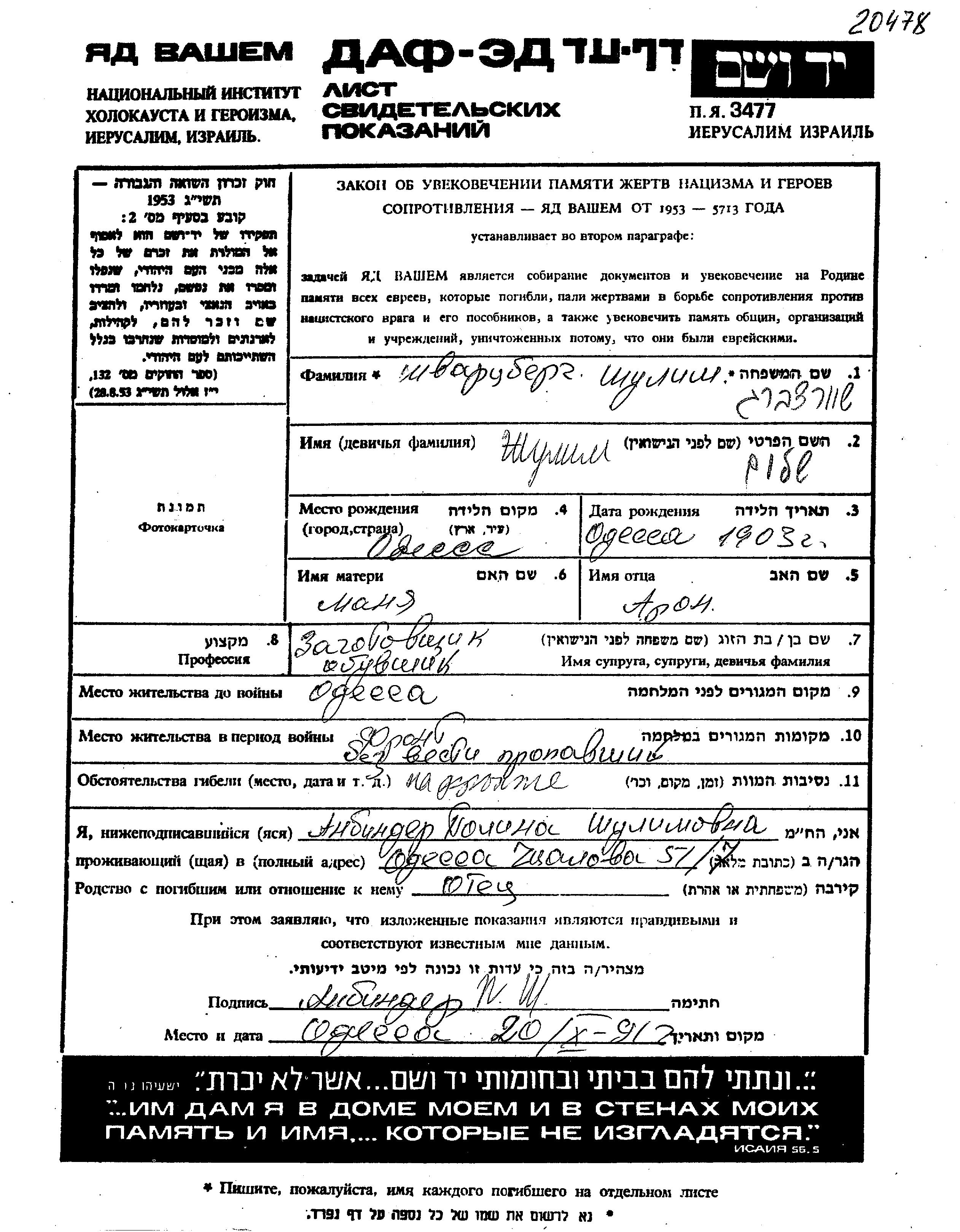 Шулим Шварцберг, место рождения: Одесса, Украина (СССР). Место жительства до войны: Одесса, Украина (СССР).