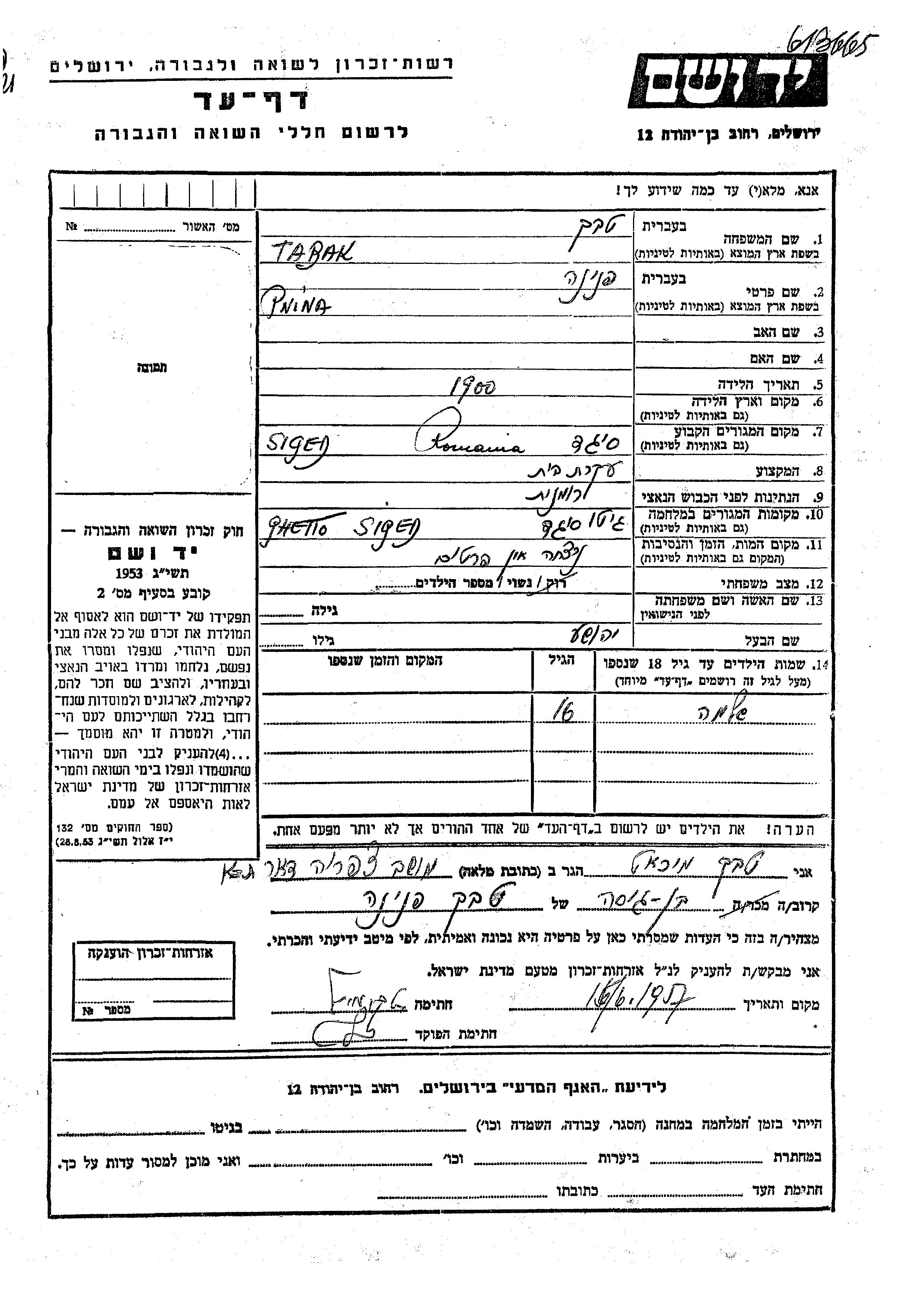 | Табак | Шломо | Сигед, Румыния | Лист свидетельских показаний | |