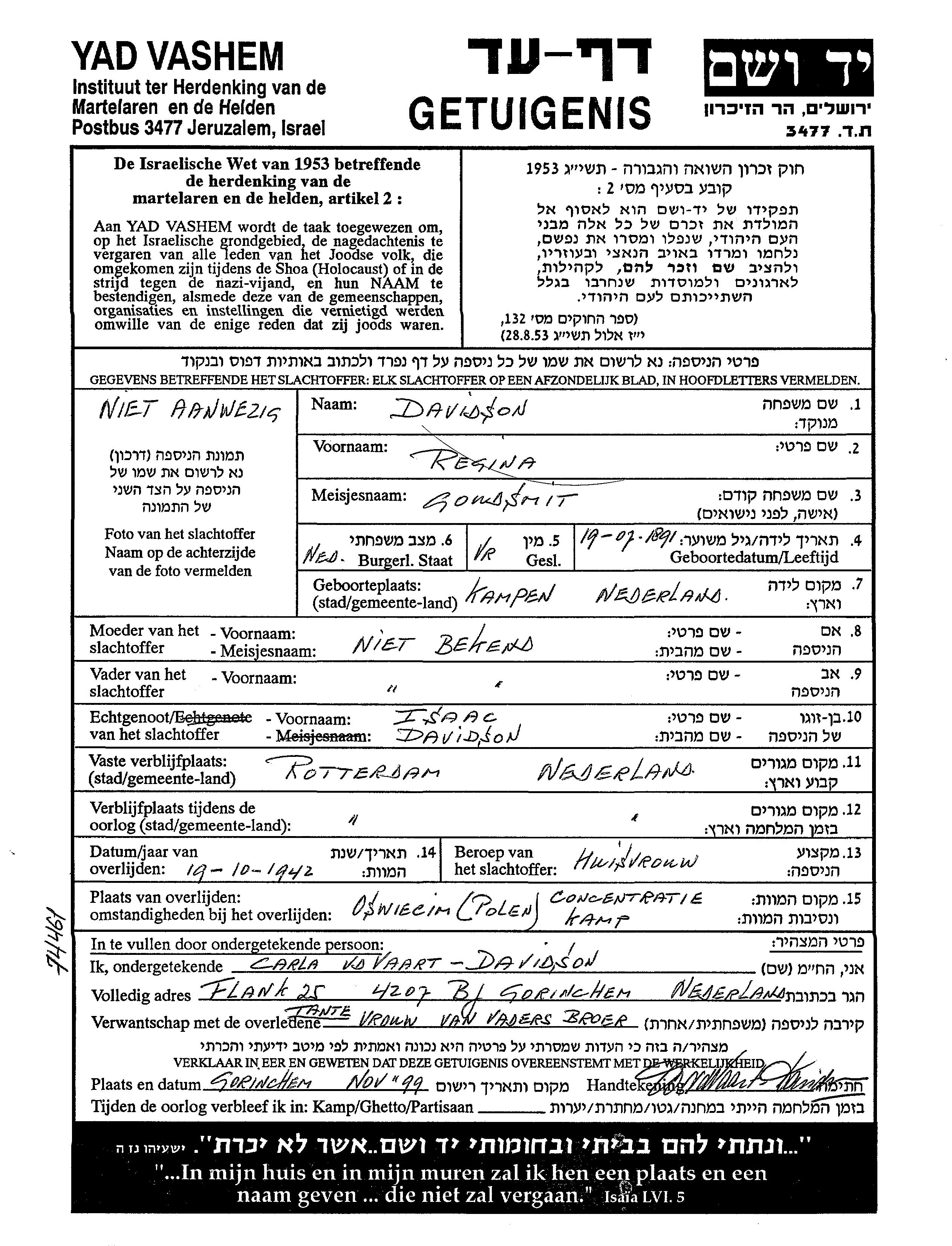 Давидсон Регина 1891 Роттердам, Нидерланды Лист свидетельских показаний