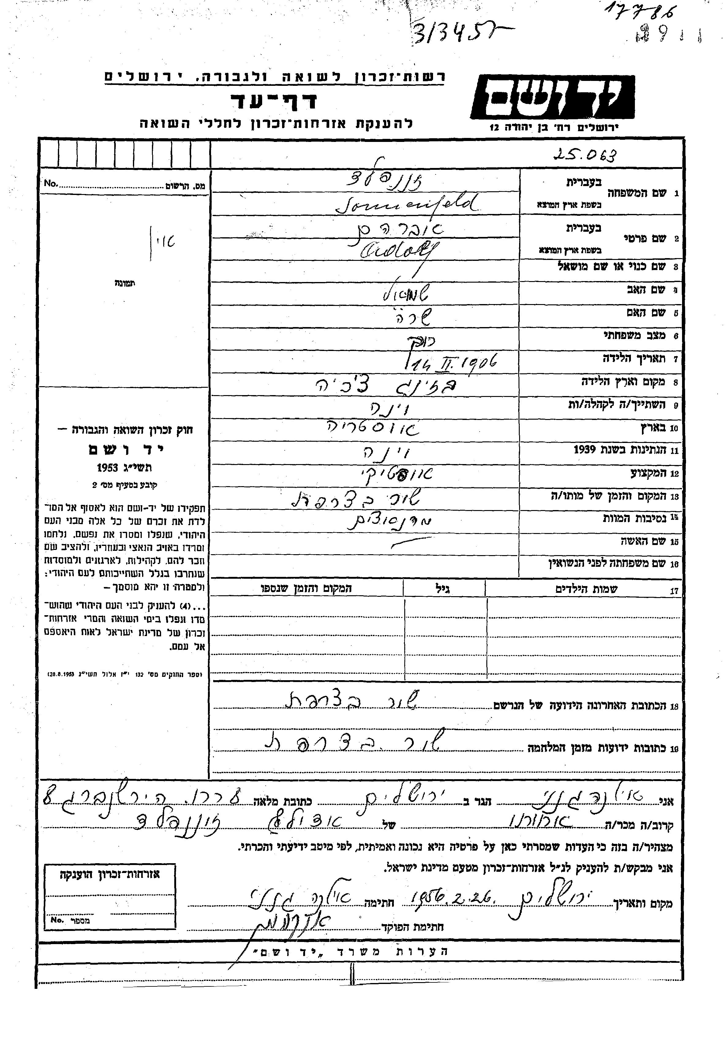 Зонненфельд Авраам Адольф 1906 Вена, Австрия Лист свидетельских показаний