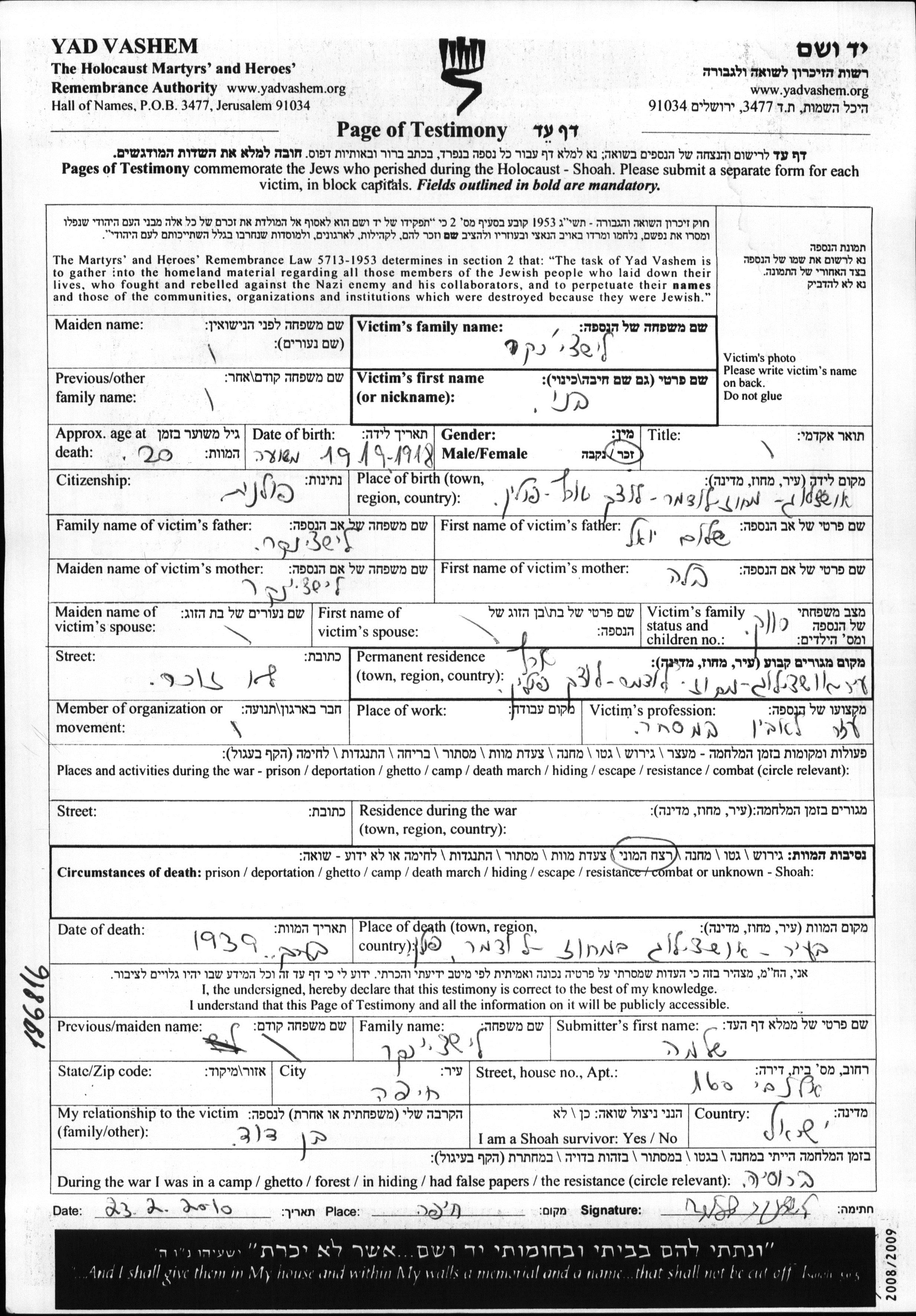 Лищинкер Бени 1918 Устилуг, Польша Лист свидетельских показаний