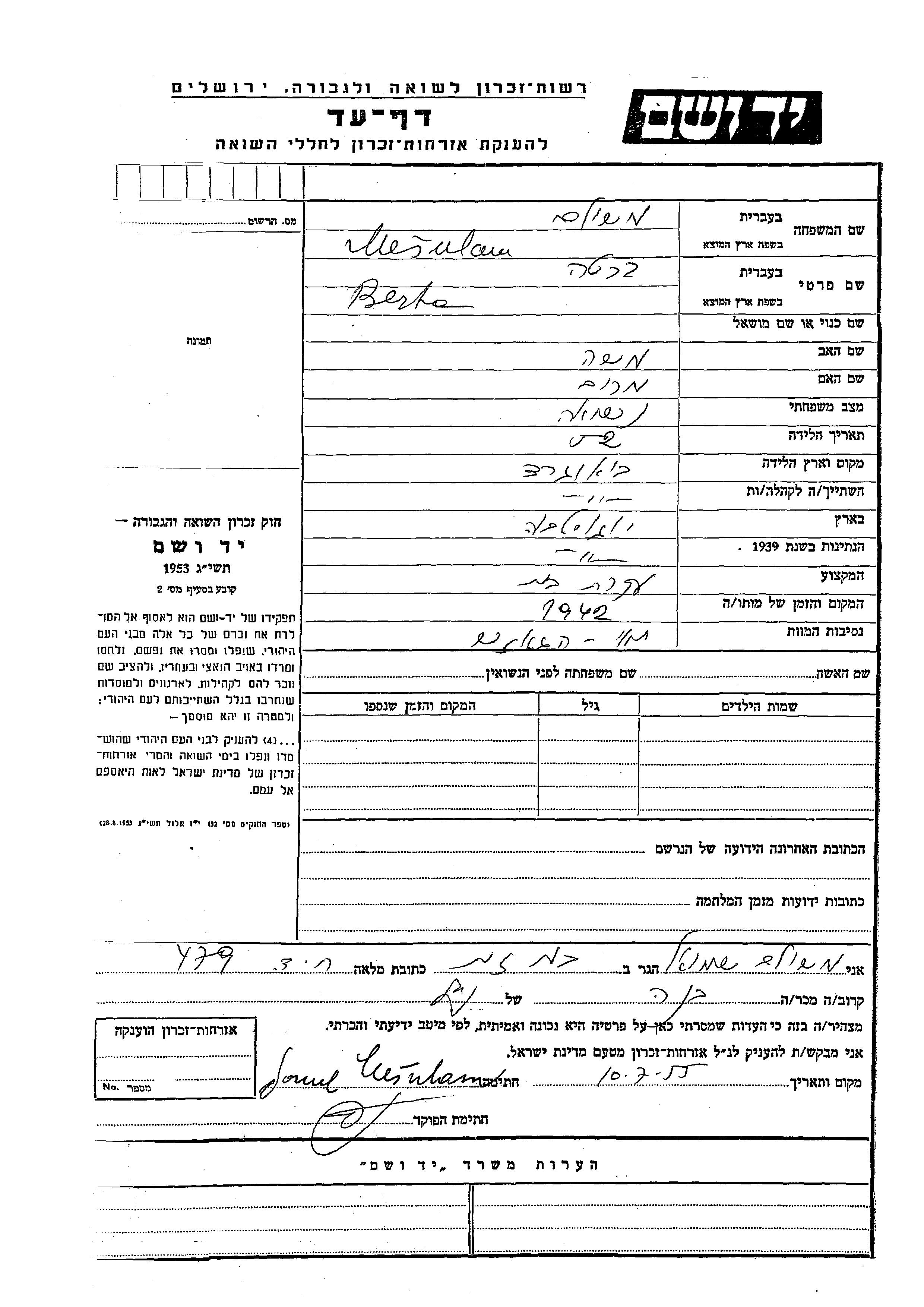 Месулам Берта Белград, Югославия Лист свидетельских показаний