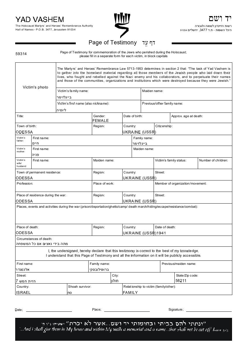 Бейгельзимер Лусия Одесса, Украина (СССР) Лист свидетельских показаний