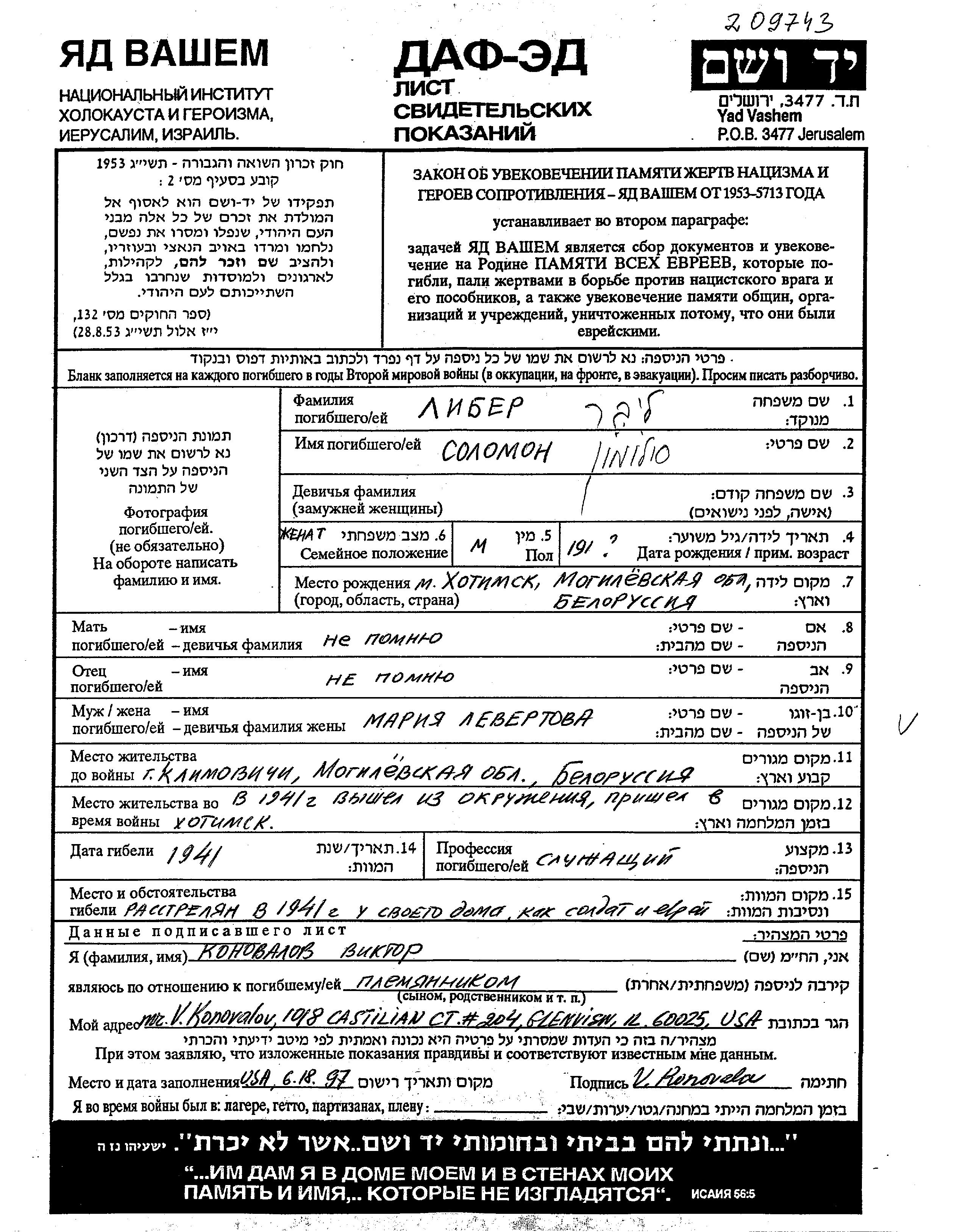 Либер Соломон 1911 Климовичи, Белоруссия (СССР) Лист свидетельских показаний