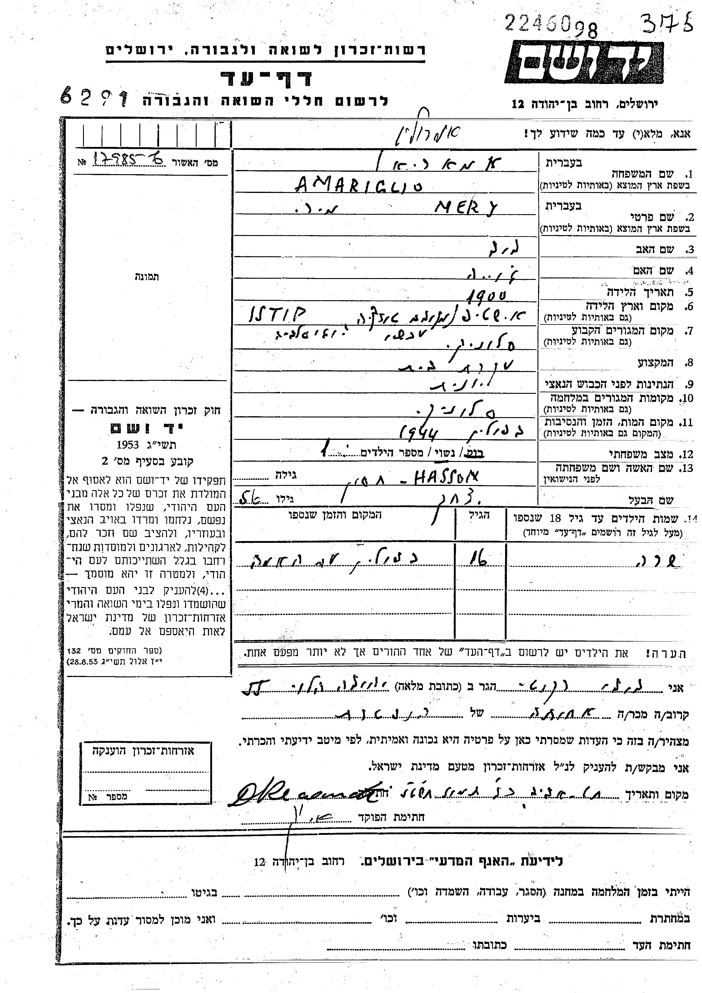 Мери Мири Амарильо, девичья фамилия Хассон, место рождения: Штип, Югославия. Домохозяйка. Место жительства до войны: Салоники, Греция.