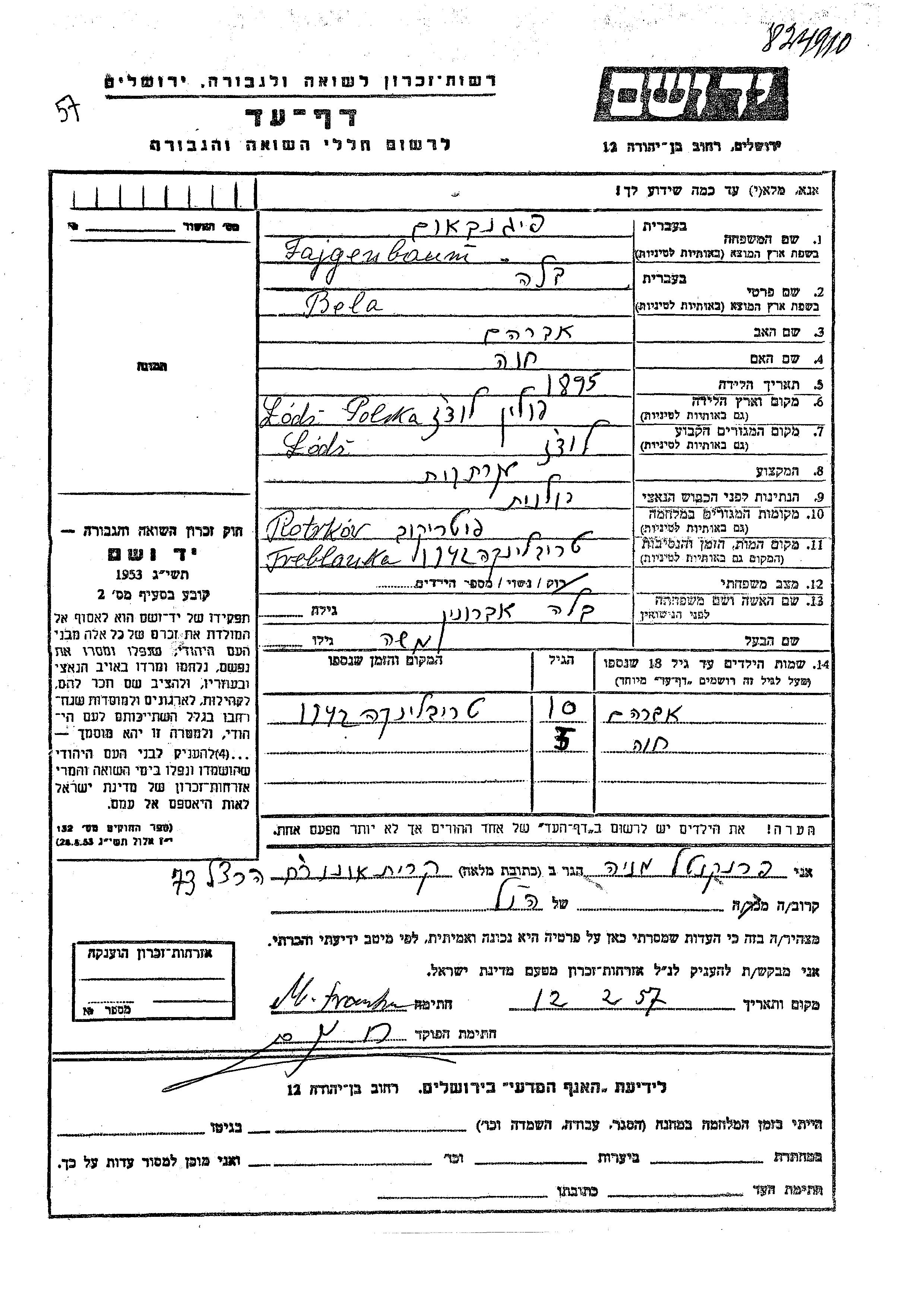 Фейгенбом Авраам Яков Лодзь, Польша Лист свидетельских показаний