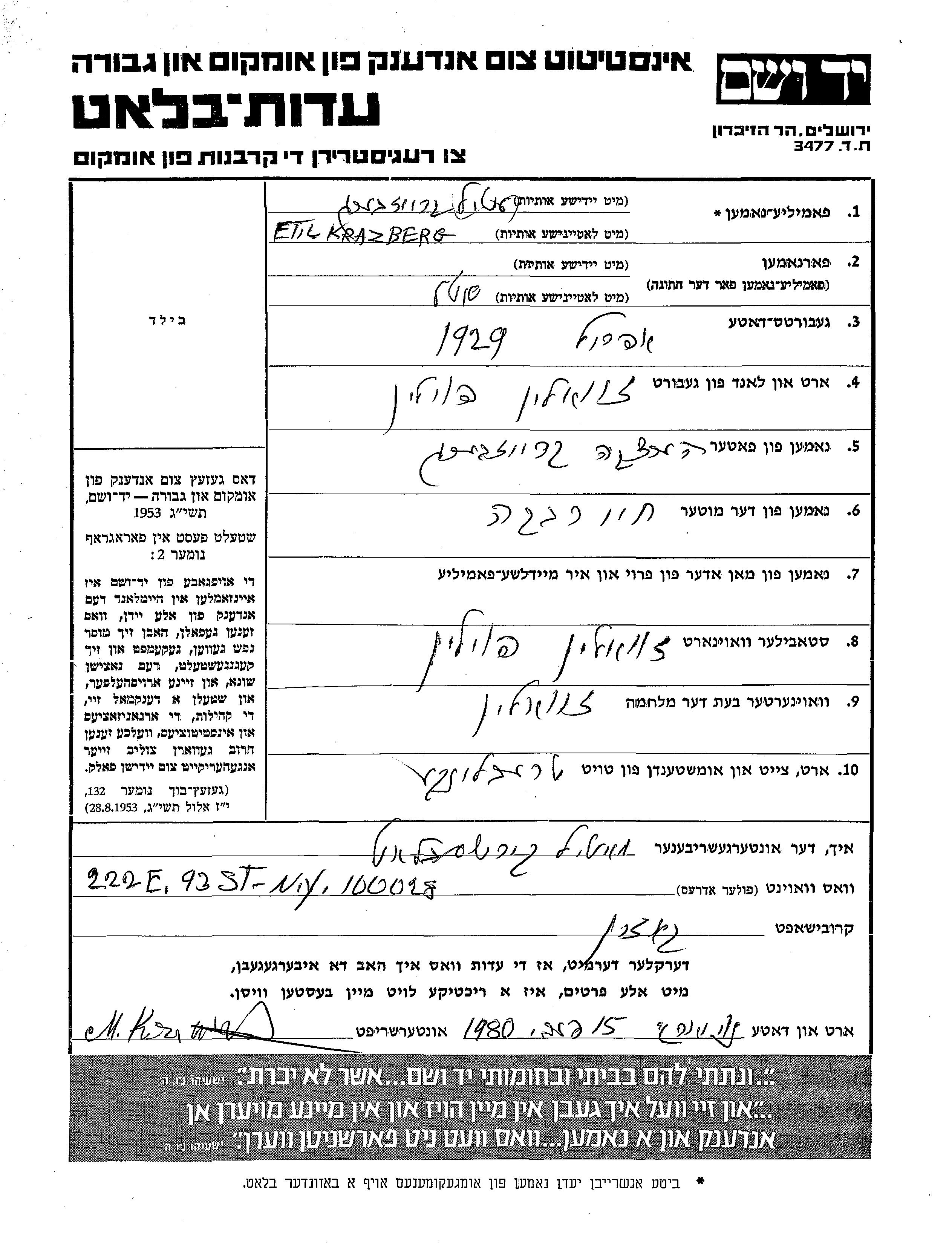 Кразберг | Этил | 1929 | Зволин, Польша | Лист свидетельских показаний |