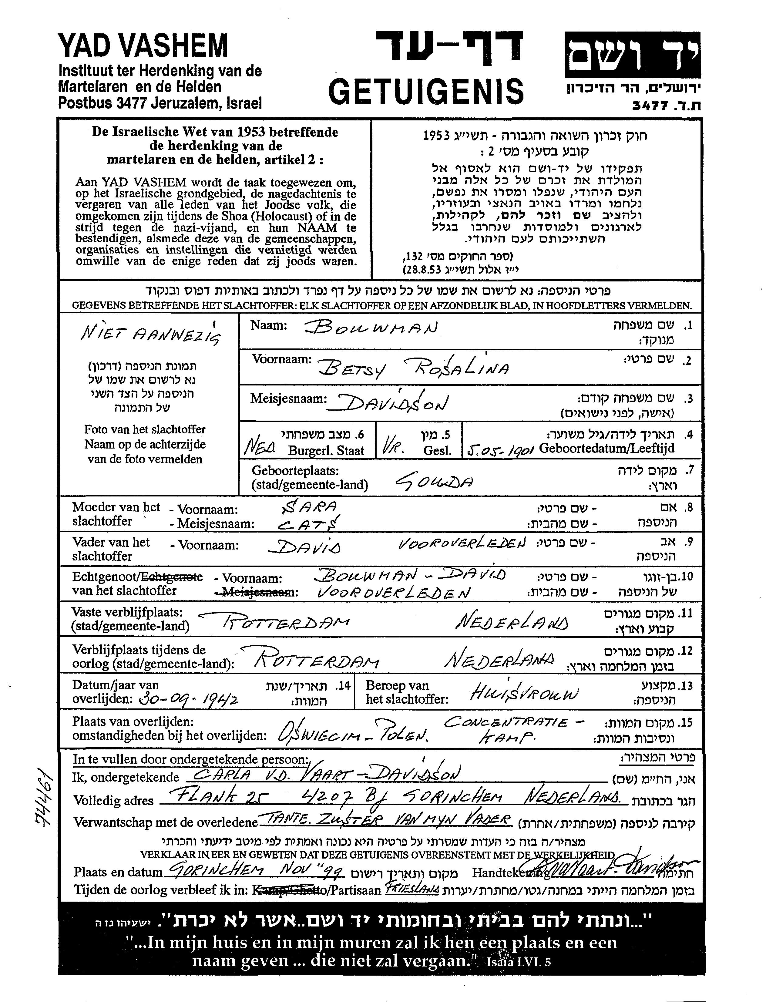 Бетси Розалина Баувман, девичья фамилия Давидсон, место рождения: Гауда, Нидерланды. Домохозяйка. Место жительства до войны: Роттердам, Нидерланды.