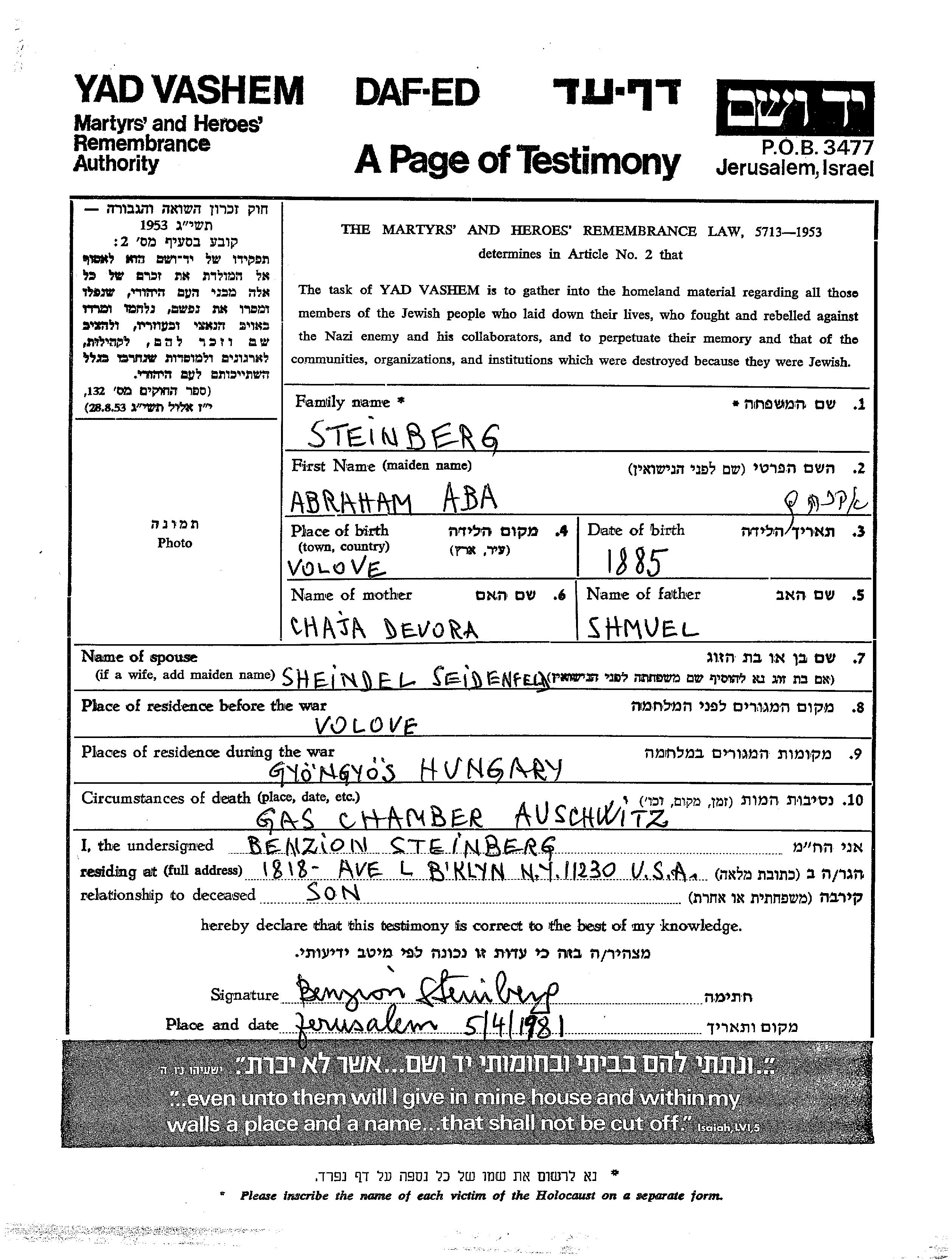Штайнберг Абраам Аба 1885 Волове, Чехословакия Лист свидетельских показаний