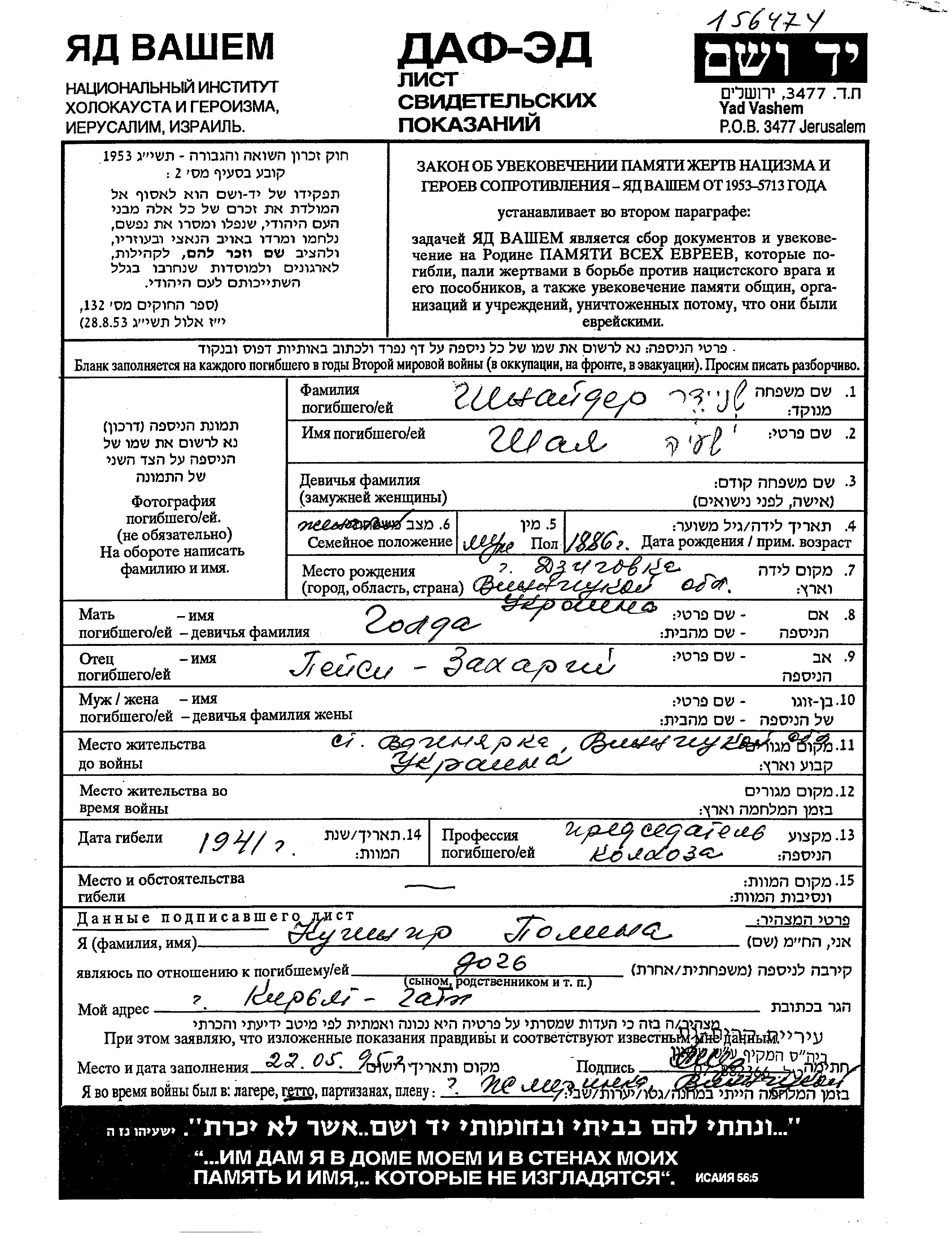 Шнайдер Шая 1886 Вапнярка, Украина (СССР) Лист свидетельских показаний