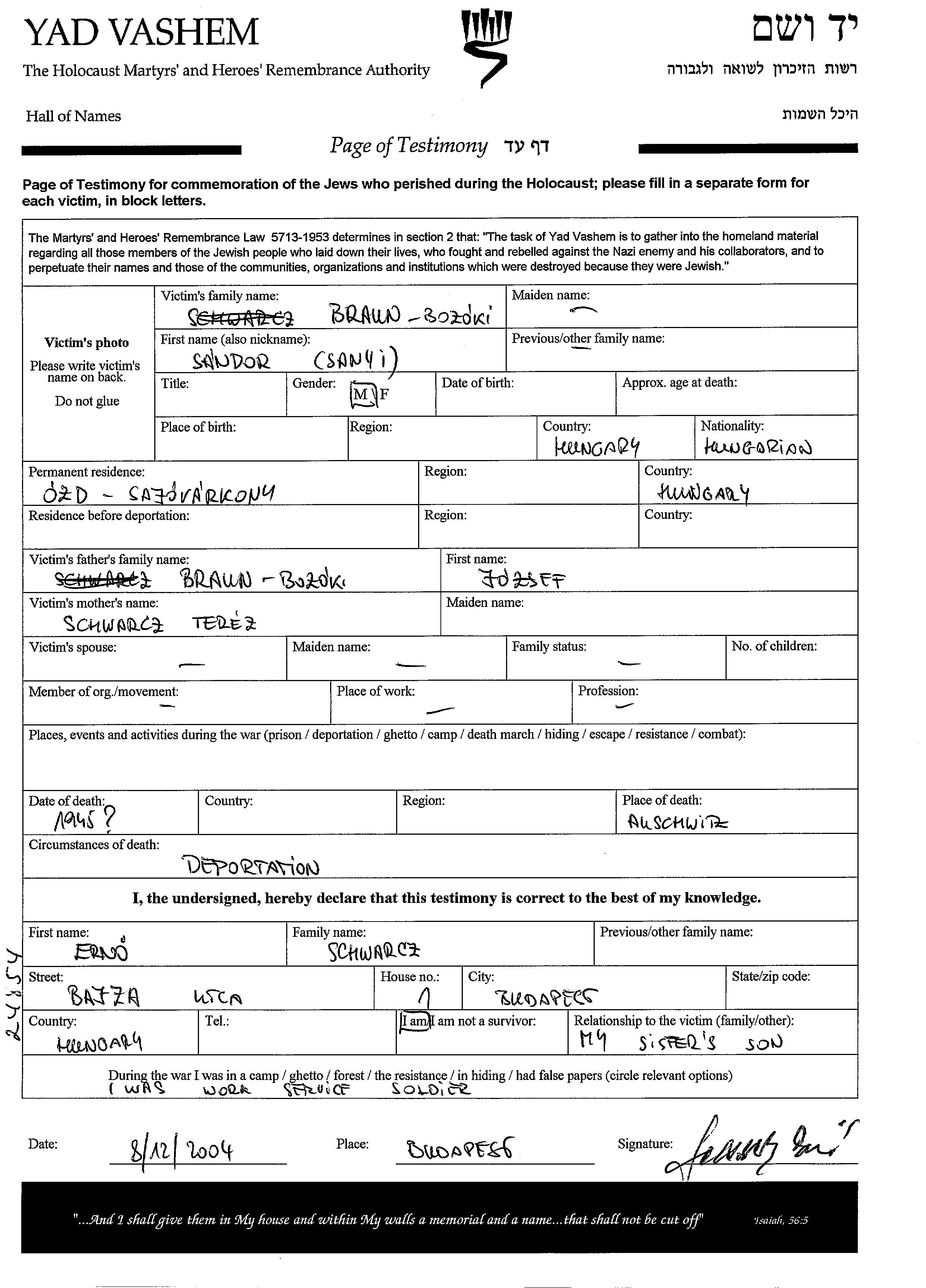 | Браун | Шандор | Озд, Венгрия | Лист свидетельских показаний |
