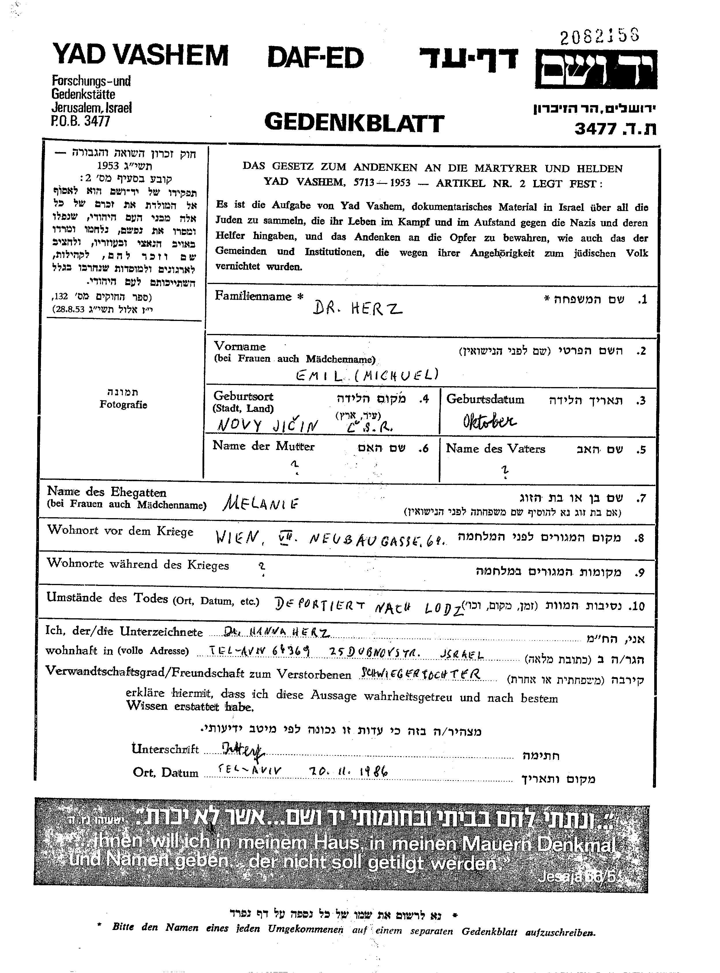 Херц | Михуэль Эмиль | Вена, Австрия | Лист свидетельских показаний | |
