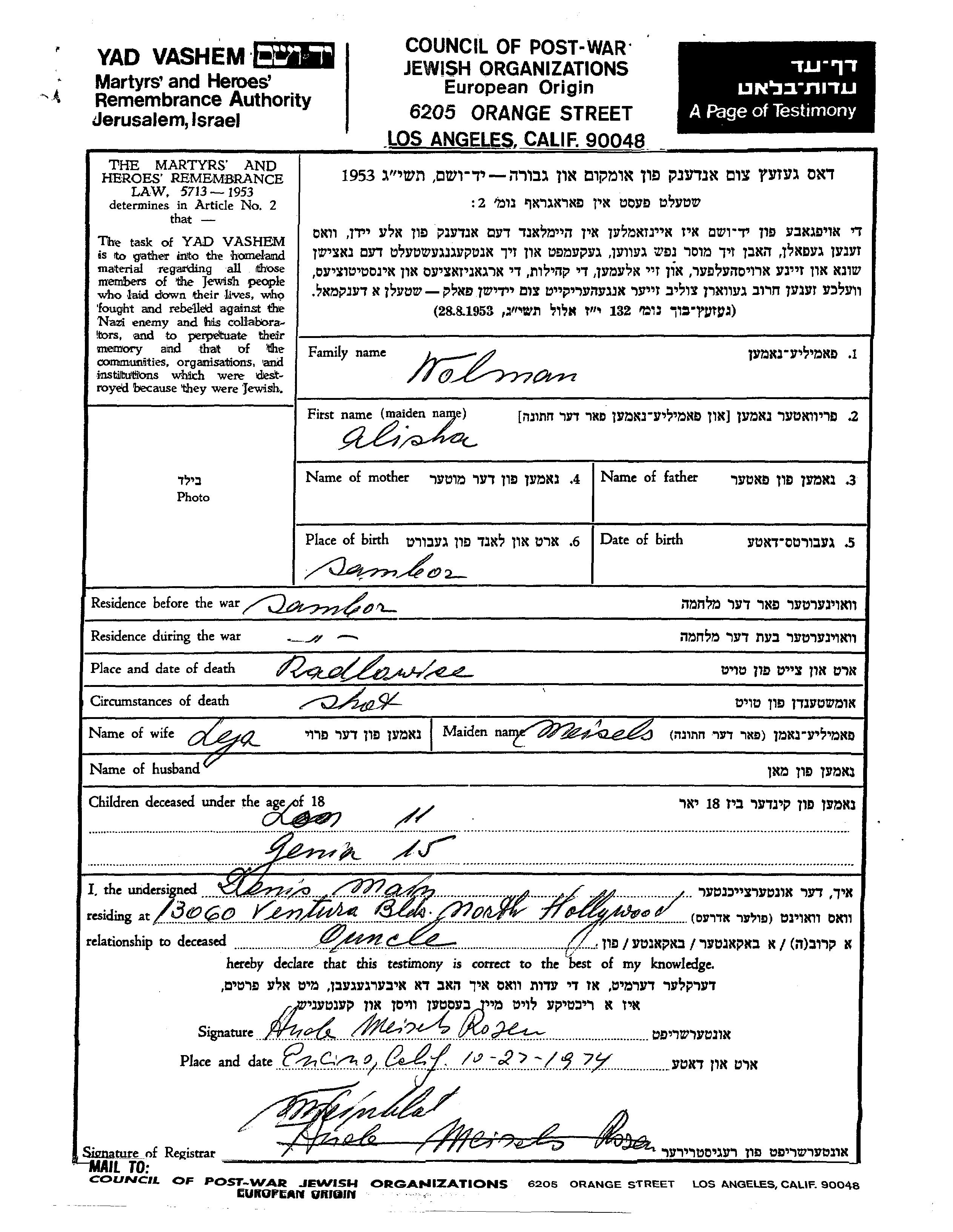 Вольман Элиша Самбор, Польша Лист свидетельских показаний