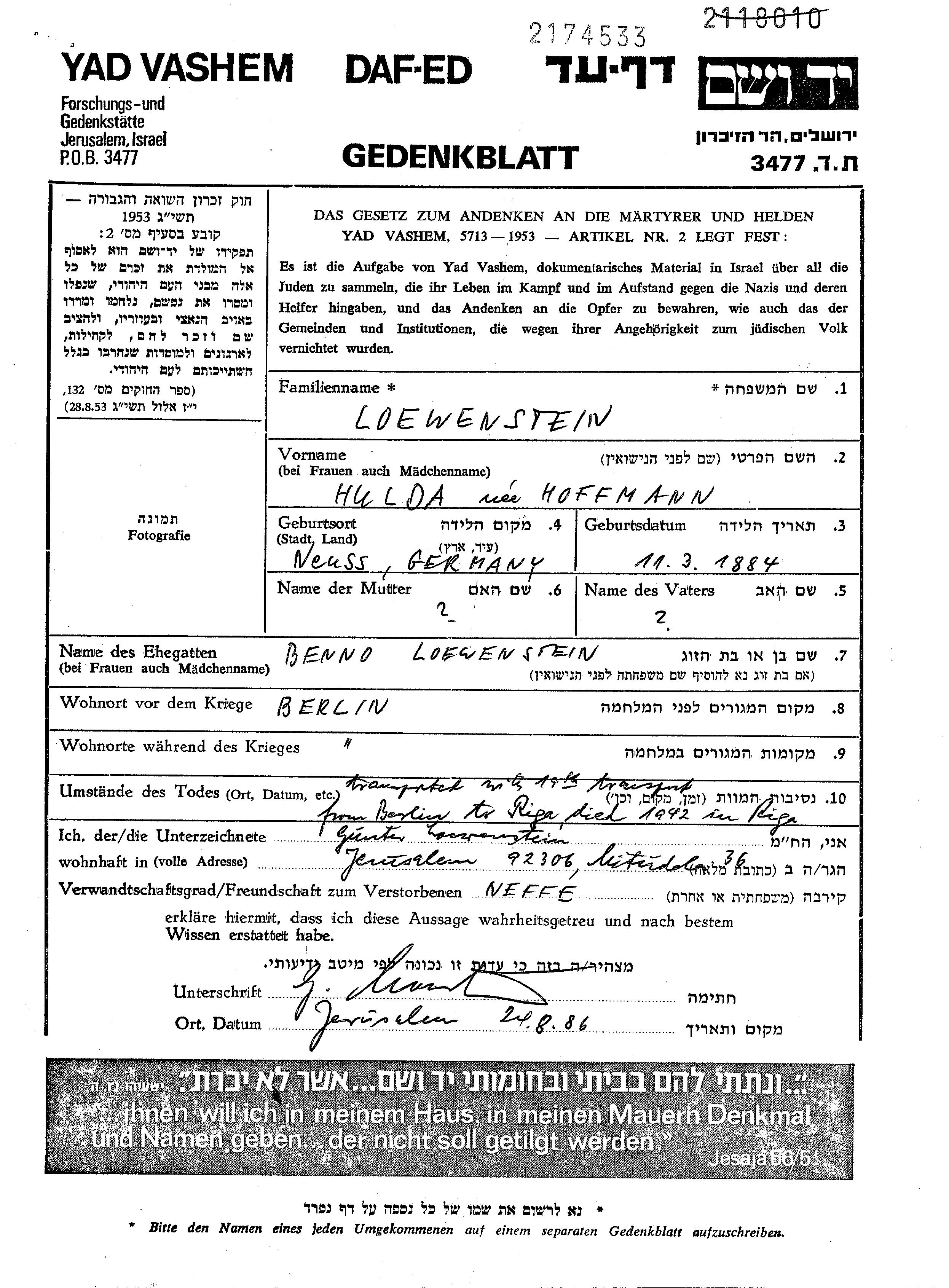 Хульда Лёвенштейн, девичья фамилия Хоффманн, место рождения: Нёйсс, Германия. Место жительства до войны: Берлин, Германия.