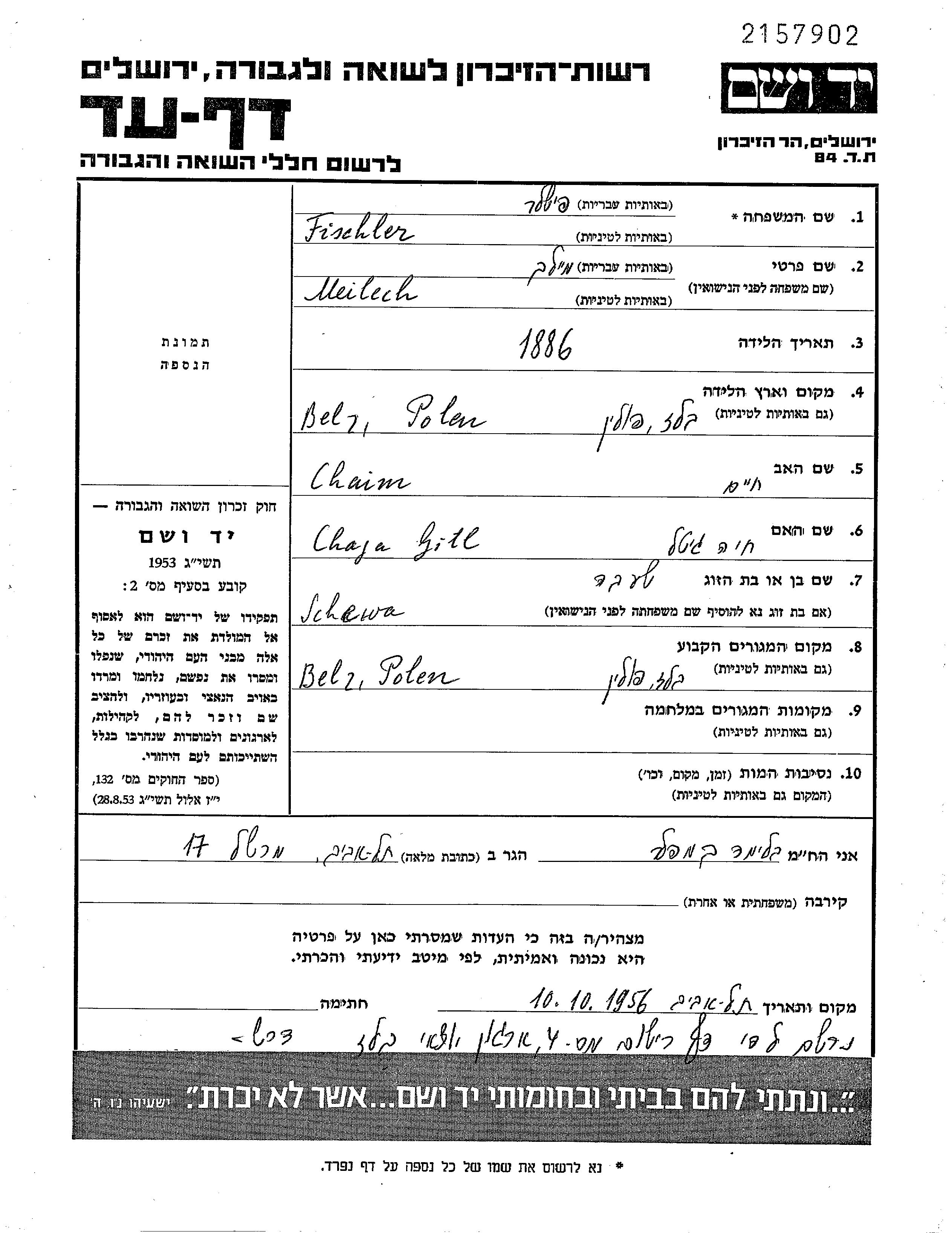Мелех Фишлер, место рождения: Белз, Польша. Место жительства до войны: Белз, Польша.