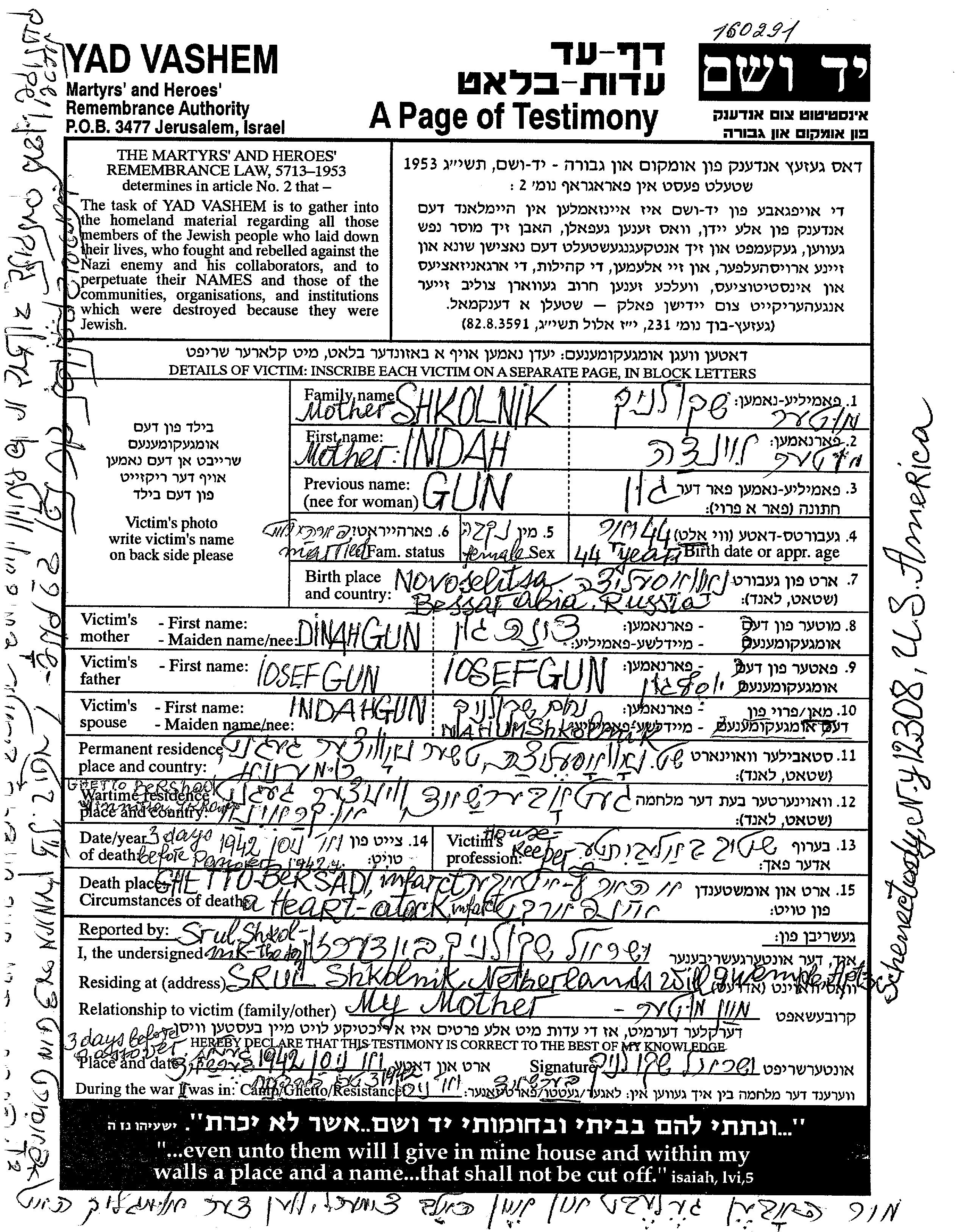 Школьник | Хинда | 1898 | Новоселица, Румыния | Лист свидетельских показаний |