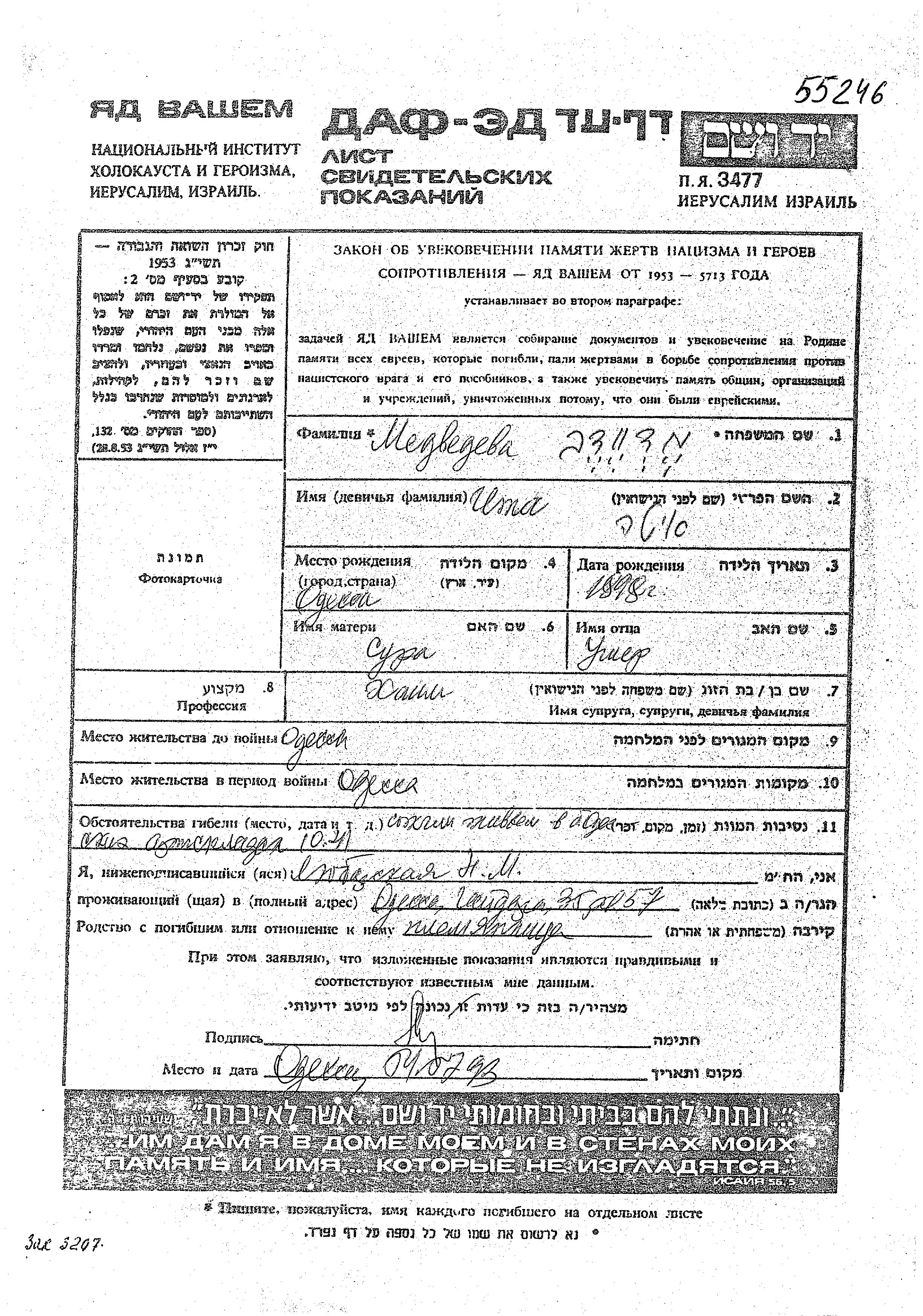 Медведев Ита 1898 Одесса, Украина (СССР) Лист свидетельских показаний