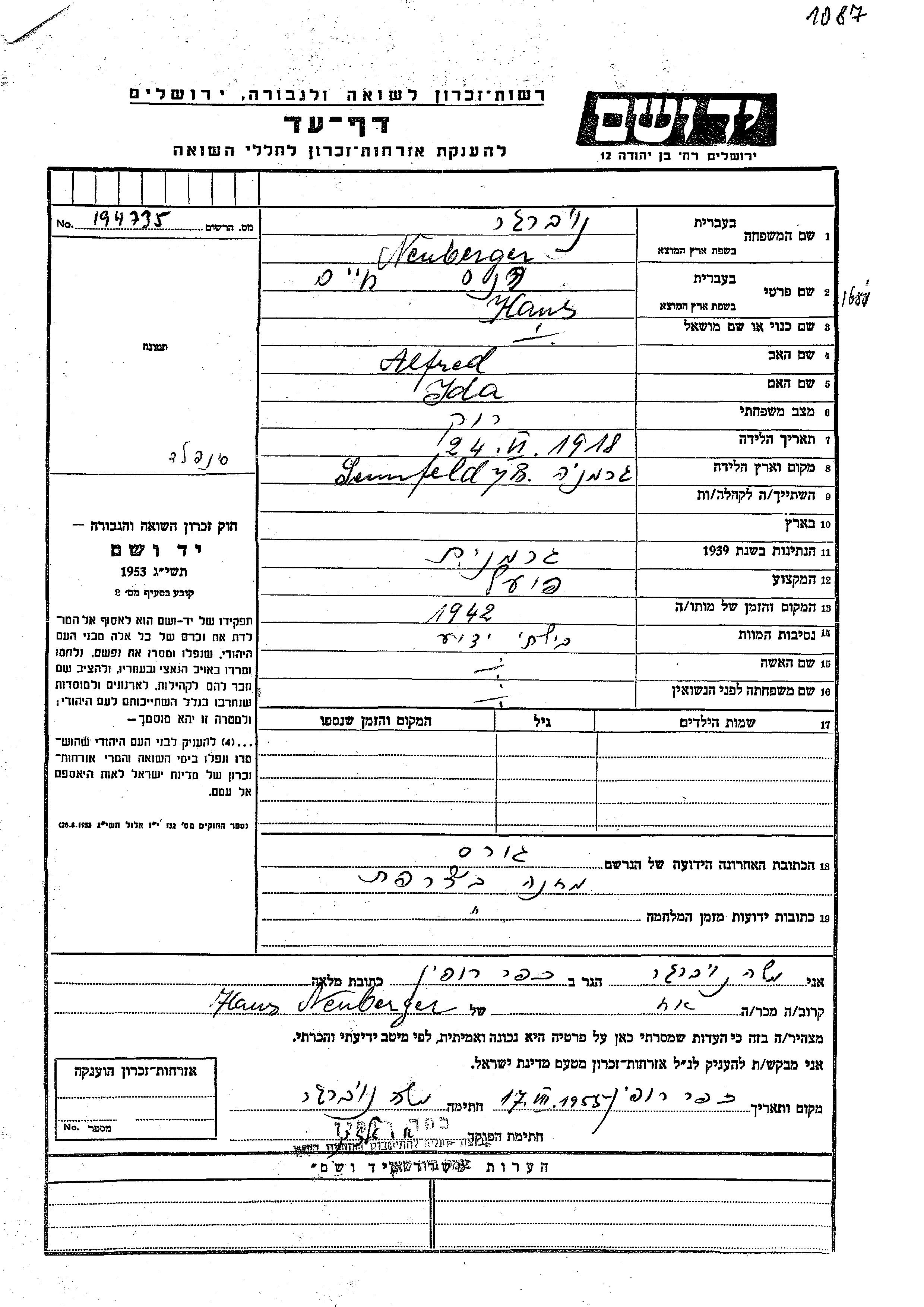 Нойбергер Ханс Хаим 1918 место не указано, Лист свидетельских показаний