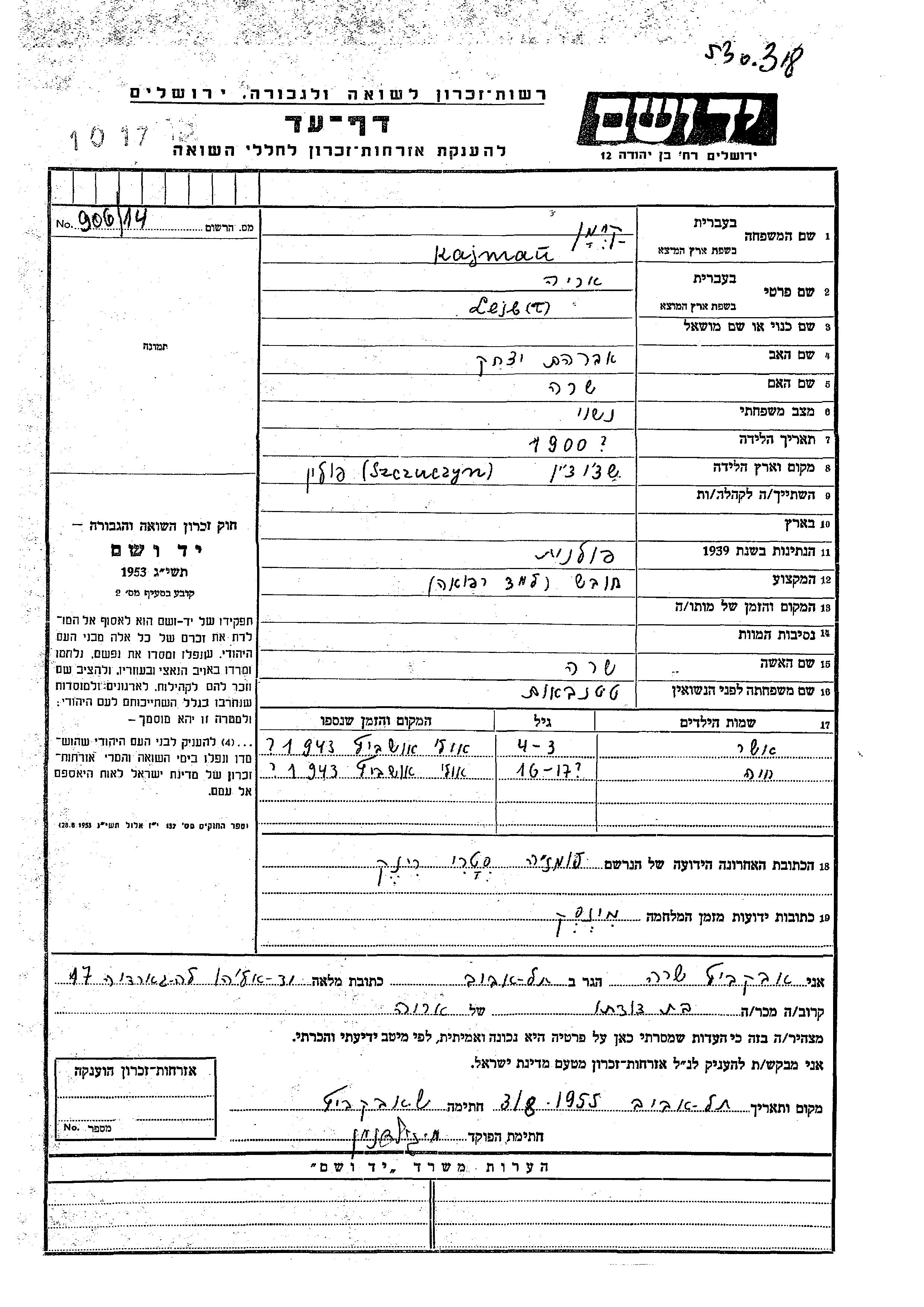 Кайман Арон Леон 1898 Ломжа, Польша Лист свидетельских показаний