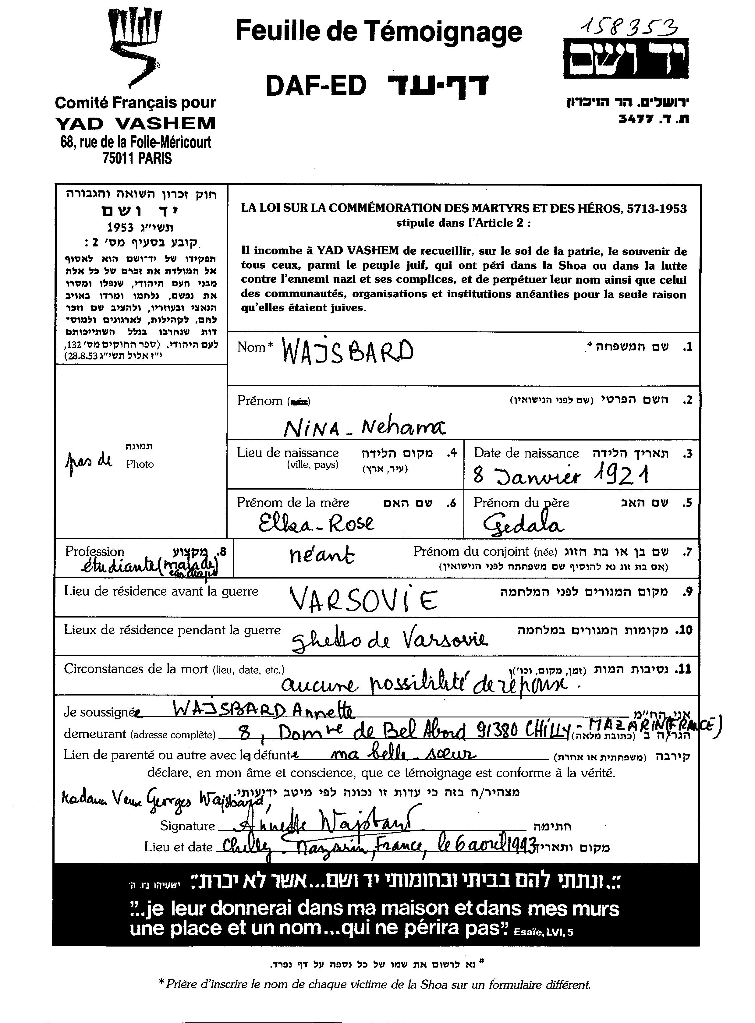 Нехама Нина Вайсбард, место рождения: Варшава, Польша. Отец: Густав Гедала, mать:Элка Роза, девичья фамилия Берайтер. Студент / студентка. Холост / не замужем. Место жительства до войны: Варшава, Польша. Место во время войны: Варшава, Польша.
