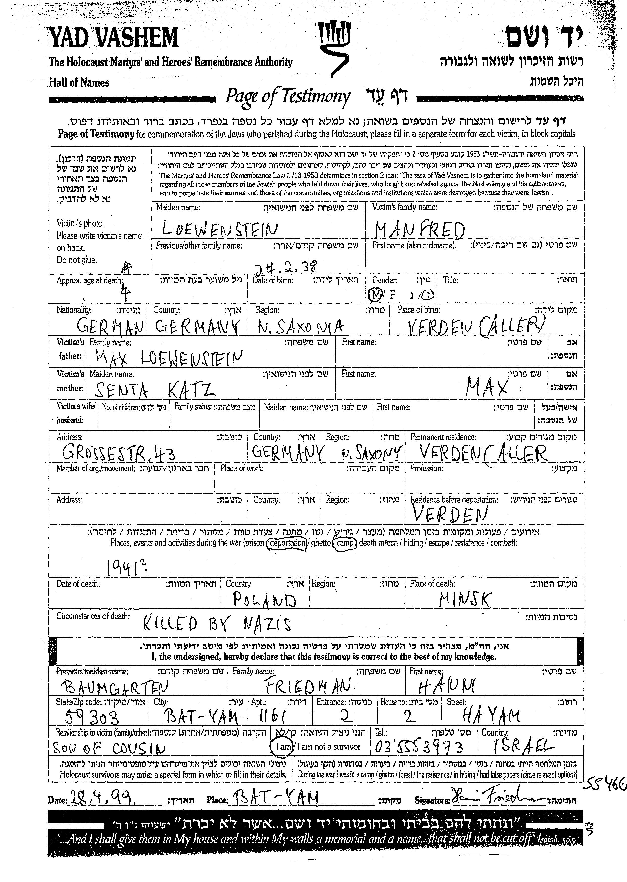 Манфред уничтожен в период Шоа. место смерти: Минск, Белоруссия (СССР).