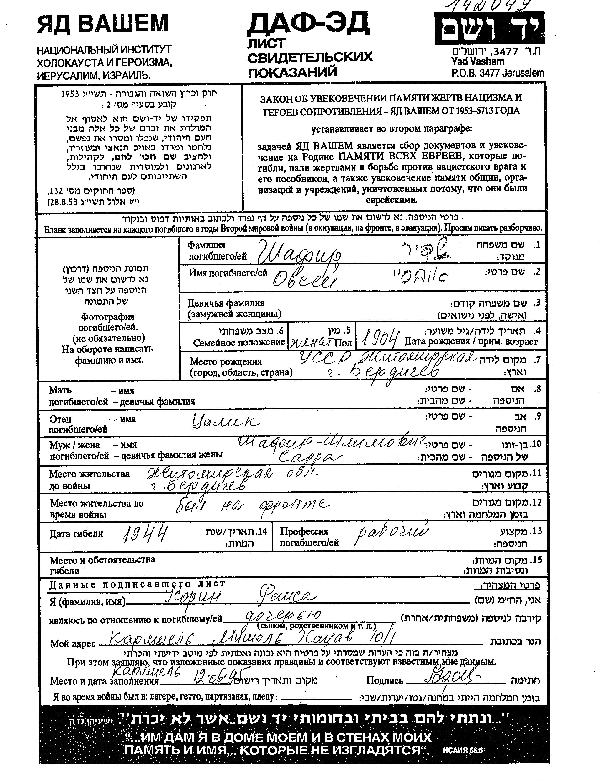 Шафир | Овсей | 1904 | Бердичев, Украина (СССР) | Лист свидетельских показаний |