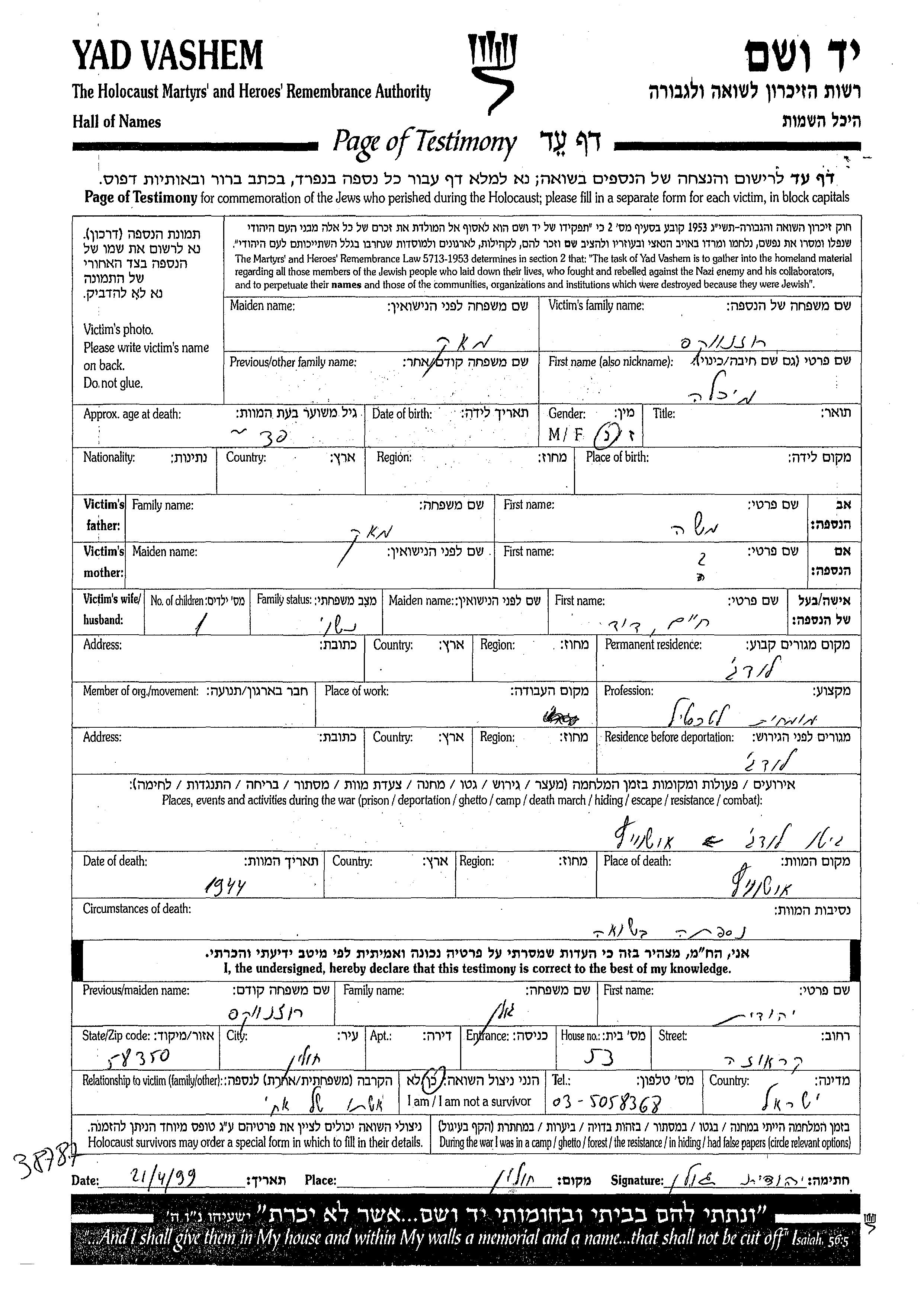 Розенвакс Михла Лодзь, Польша Лист свидетельских показаний