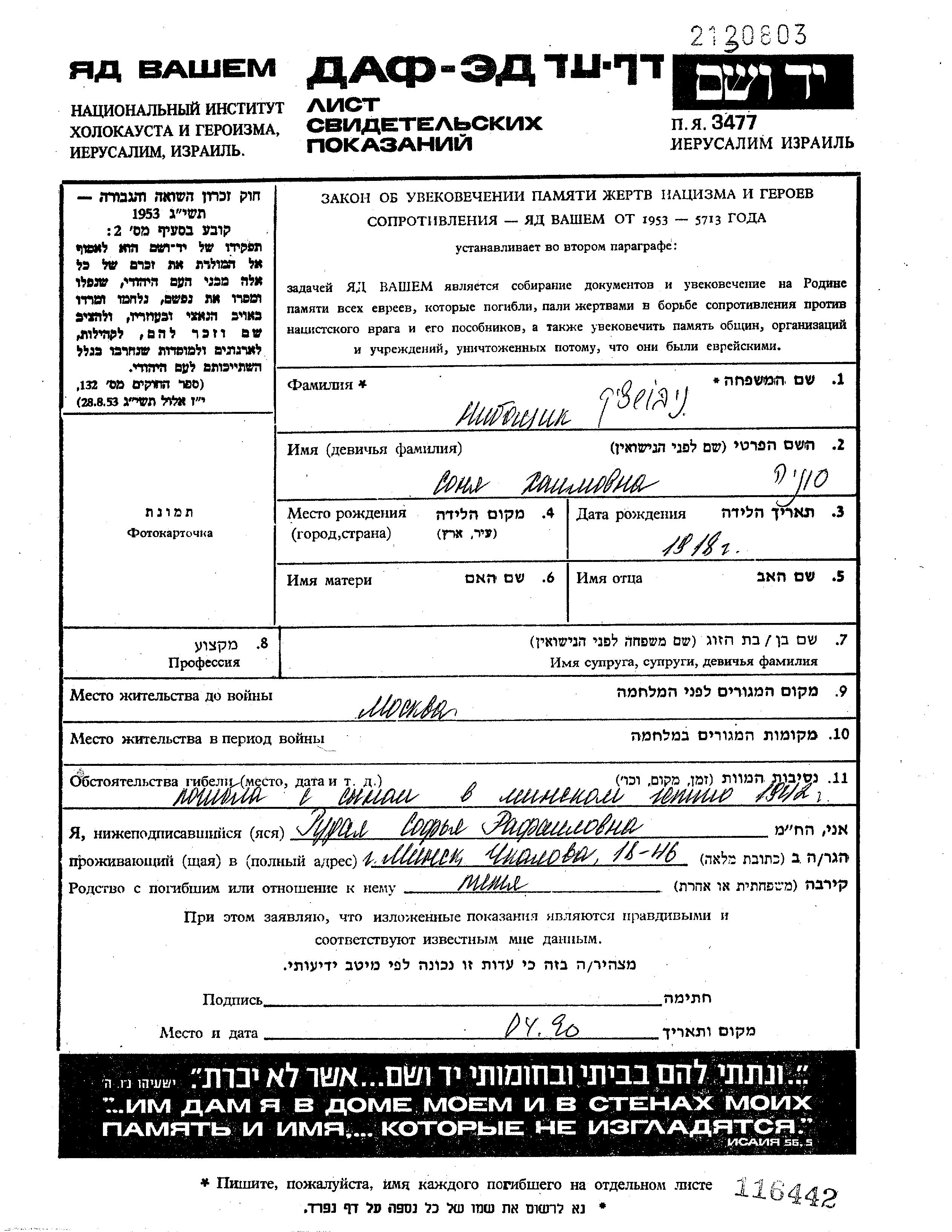 Яд Вашем - Листы свидетельских показаний Мемориального фонда