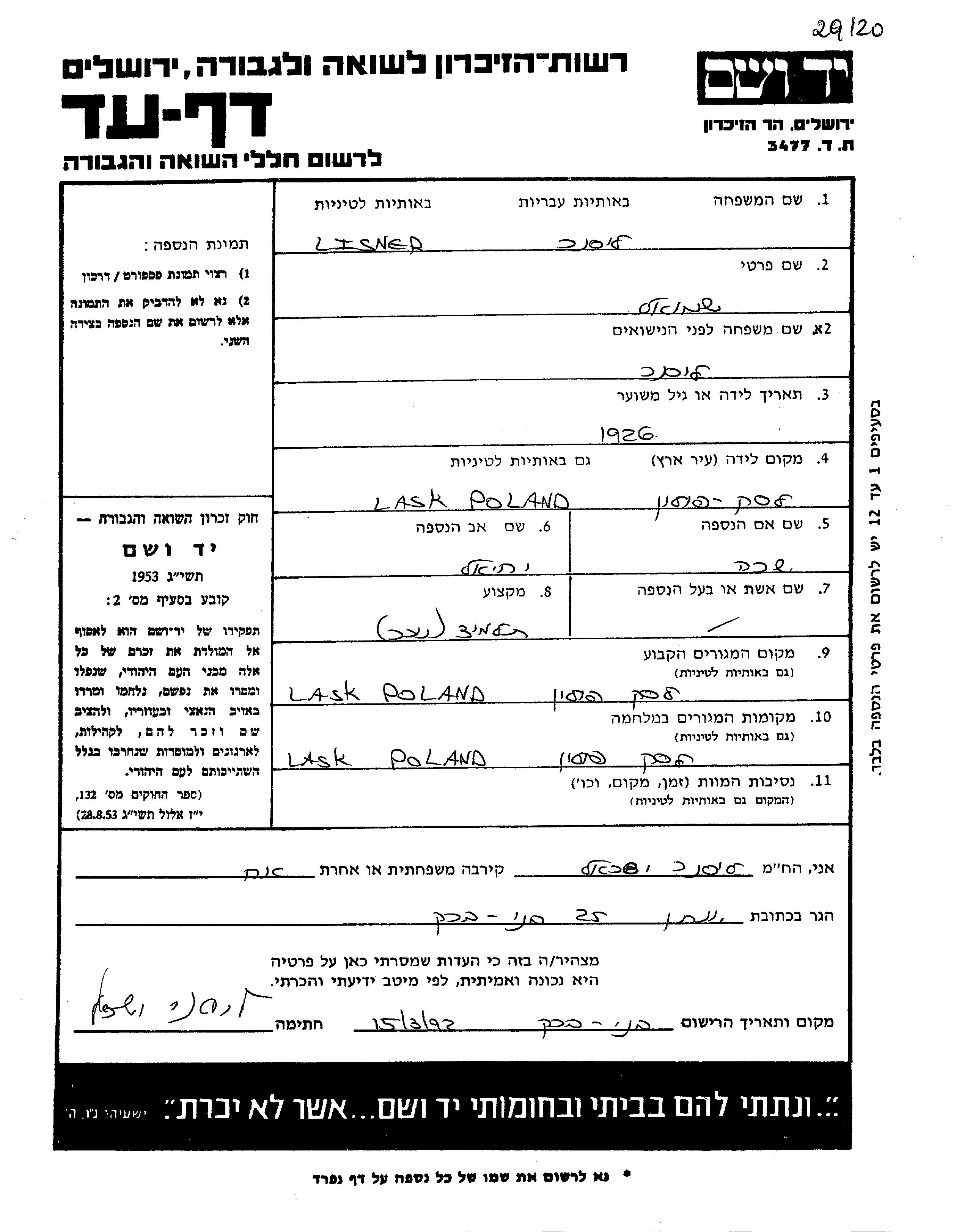 Лиснер Шмуэль 1926 Ласк, Польша Лист свидетельских показаний