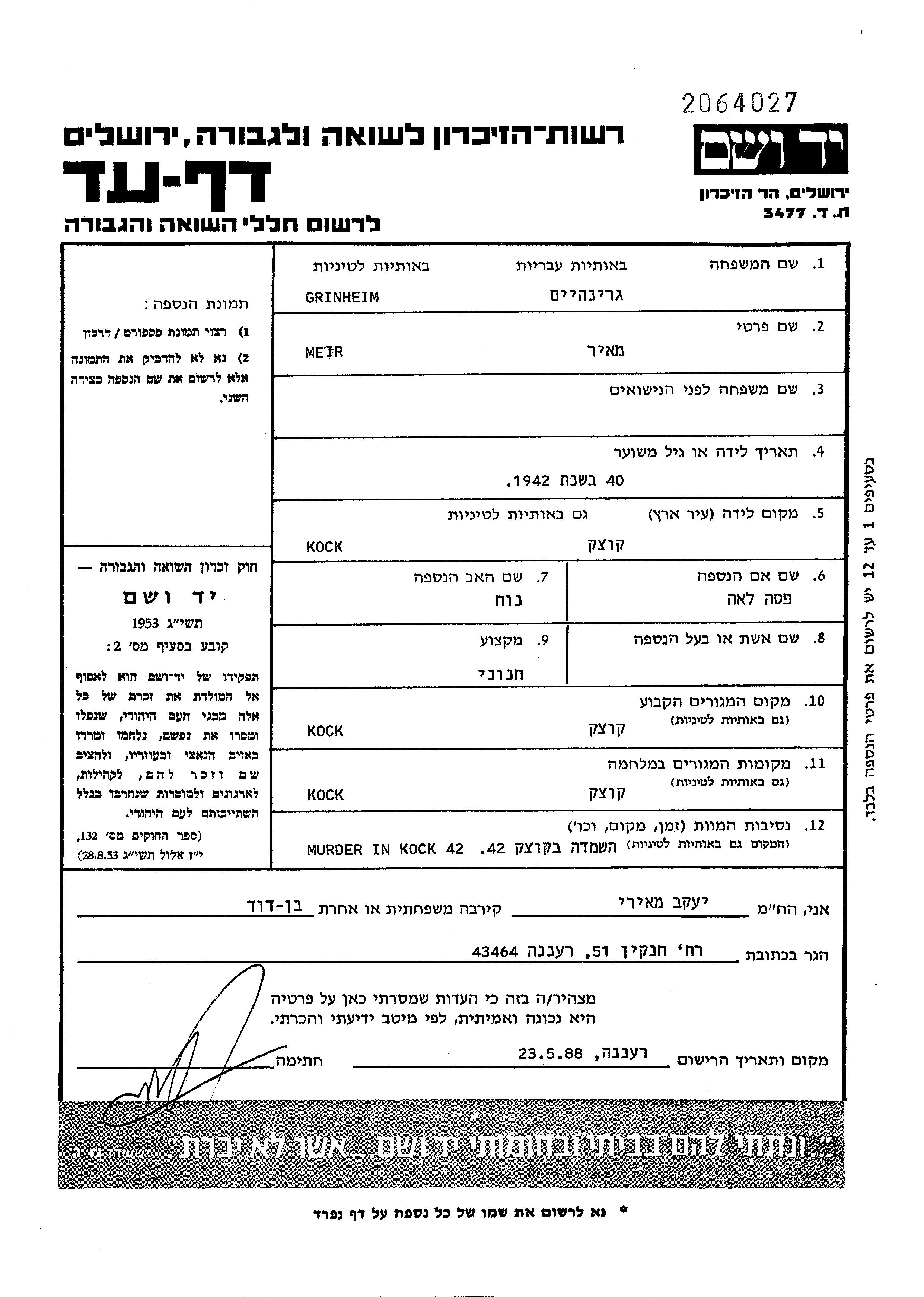 Гринхайм Меир 1902 Коцк, Польша Лист свидетельских показаний