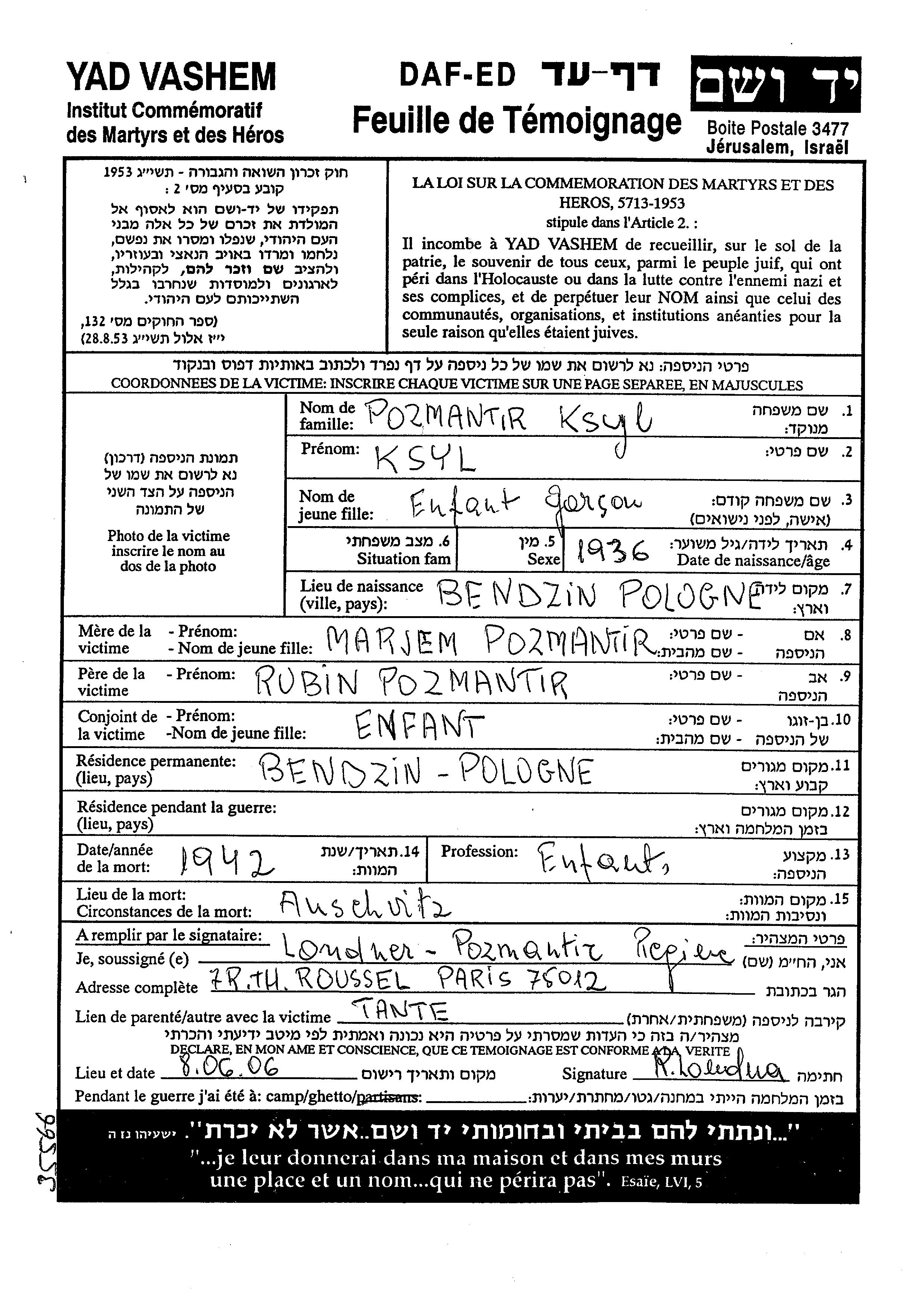 Позмантир Ксиль 1936 Бендзин, Польша Лист свидетельских показаний