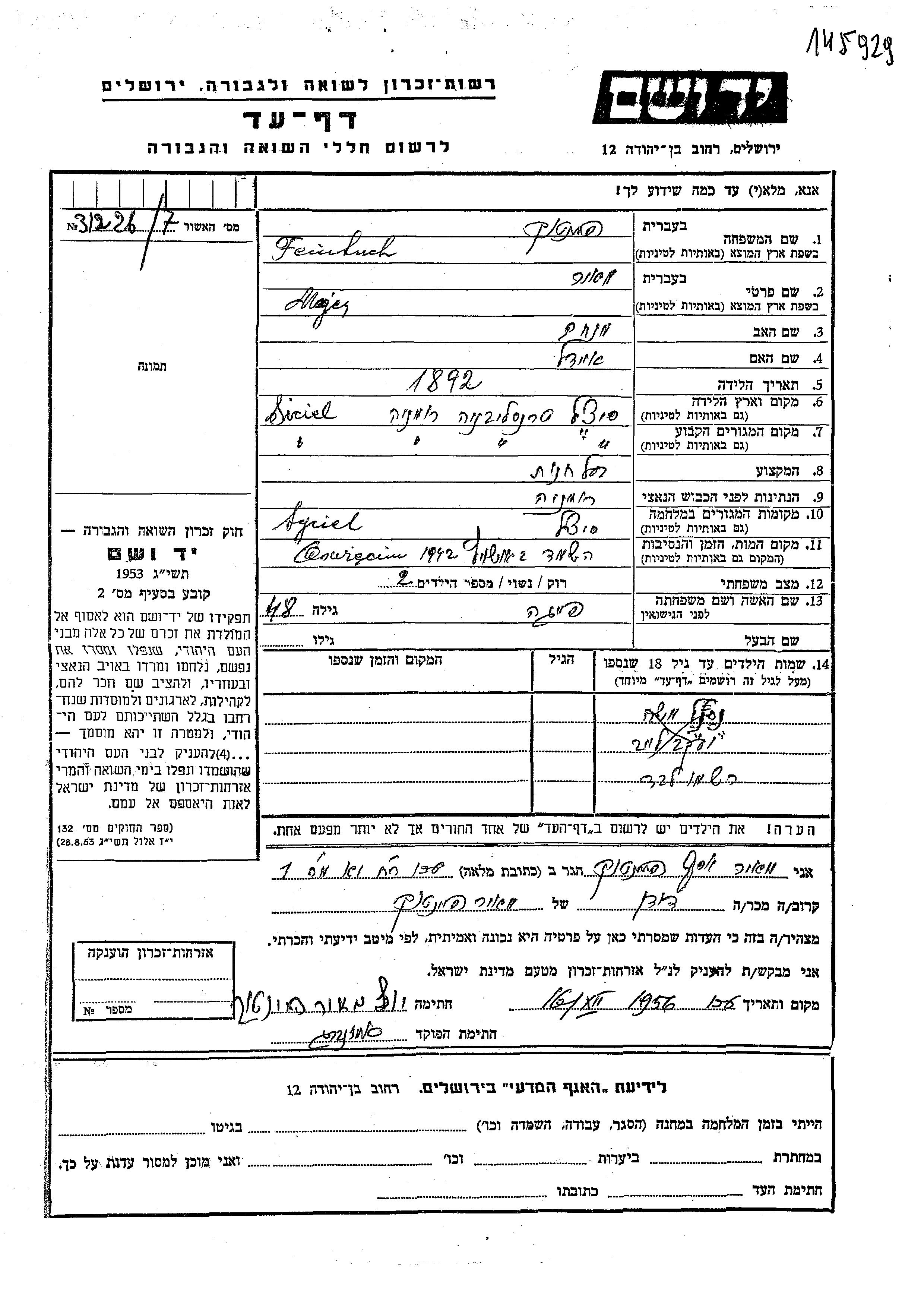 Файнтух | Моше | Сэчеле, Румыния | Лист свидетельских показаний | |