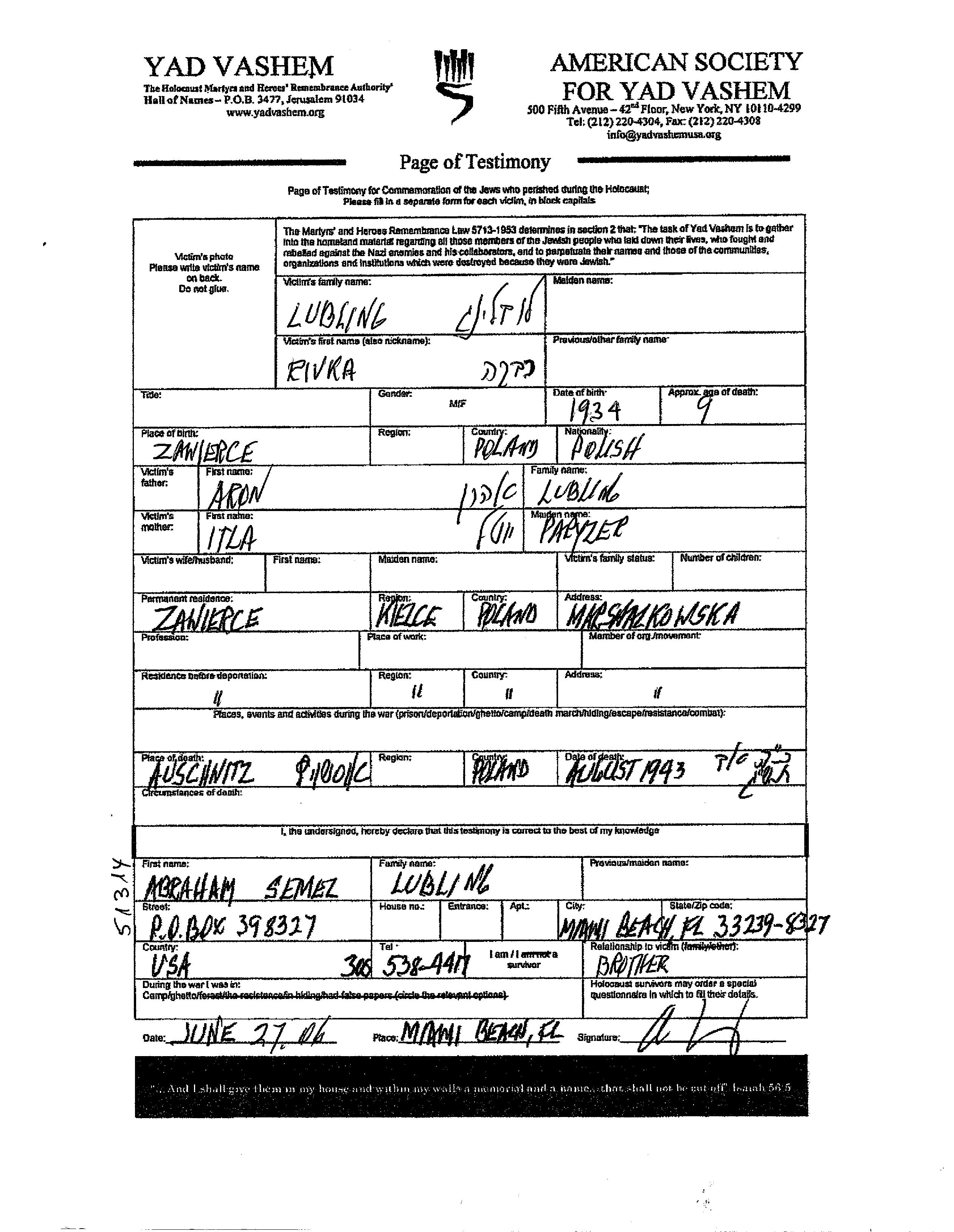 Ривка Шейна Люблинг, место рождения: Заверце, Польша. Место жительства до войны: Заверце, Польша.