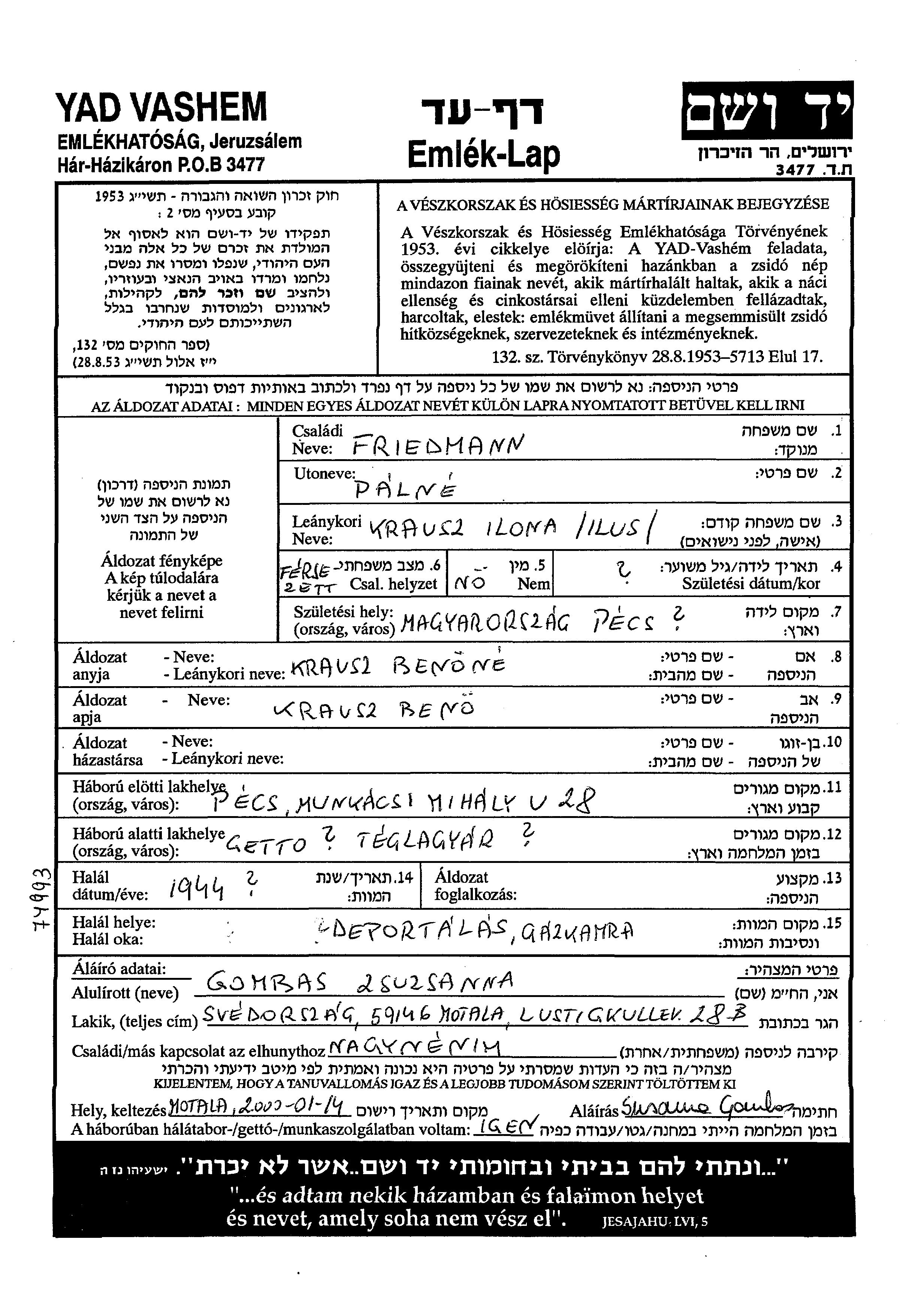 Илона Фридман, девичья фамилия Краус, место рождения: Печ, Венгрия. Место жительства до войны: Печ, Венгрия.