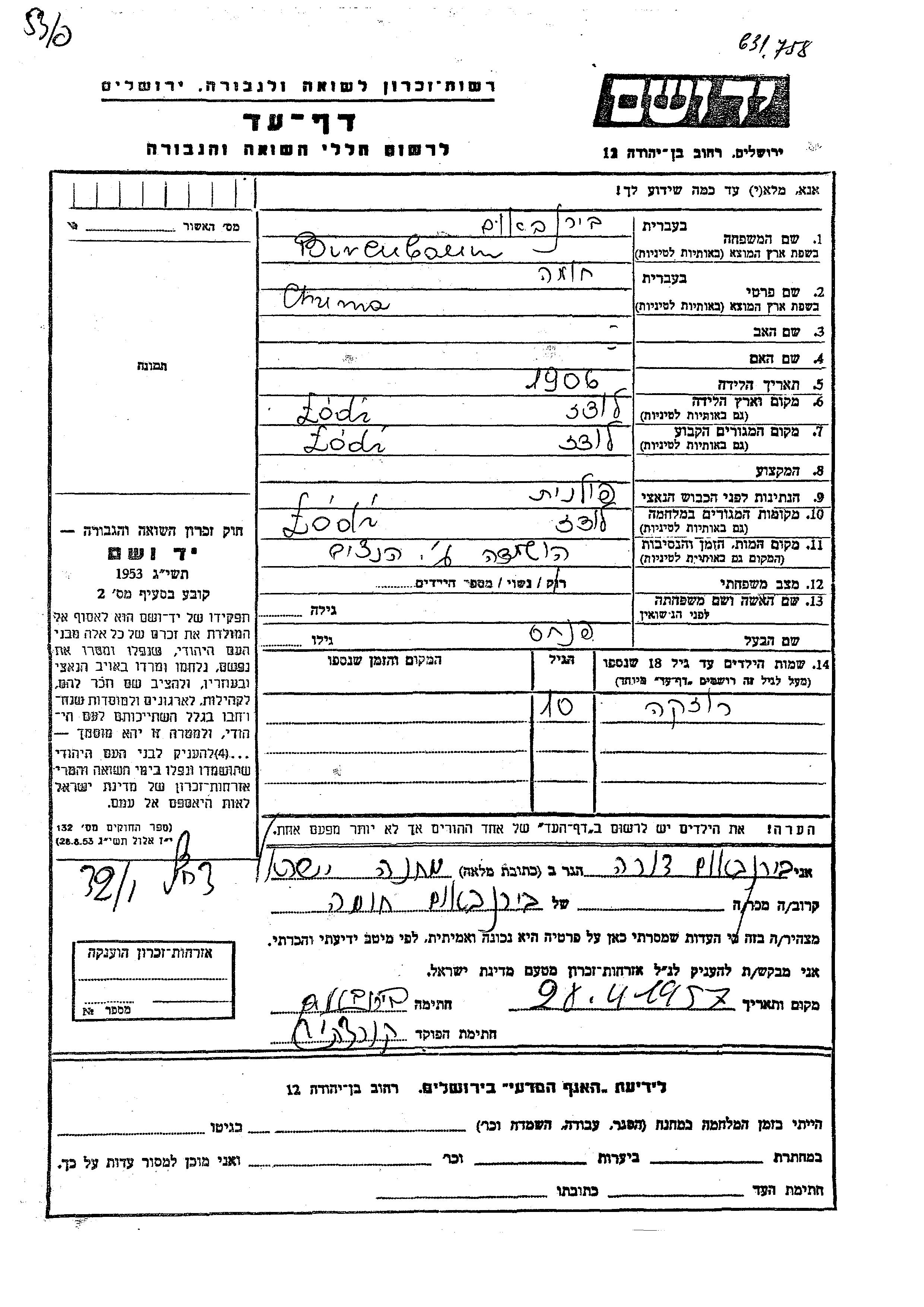 | Биренбаум | Розка | 1926 | Лодзь, Польша | Лист свидетельских показаний |