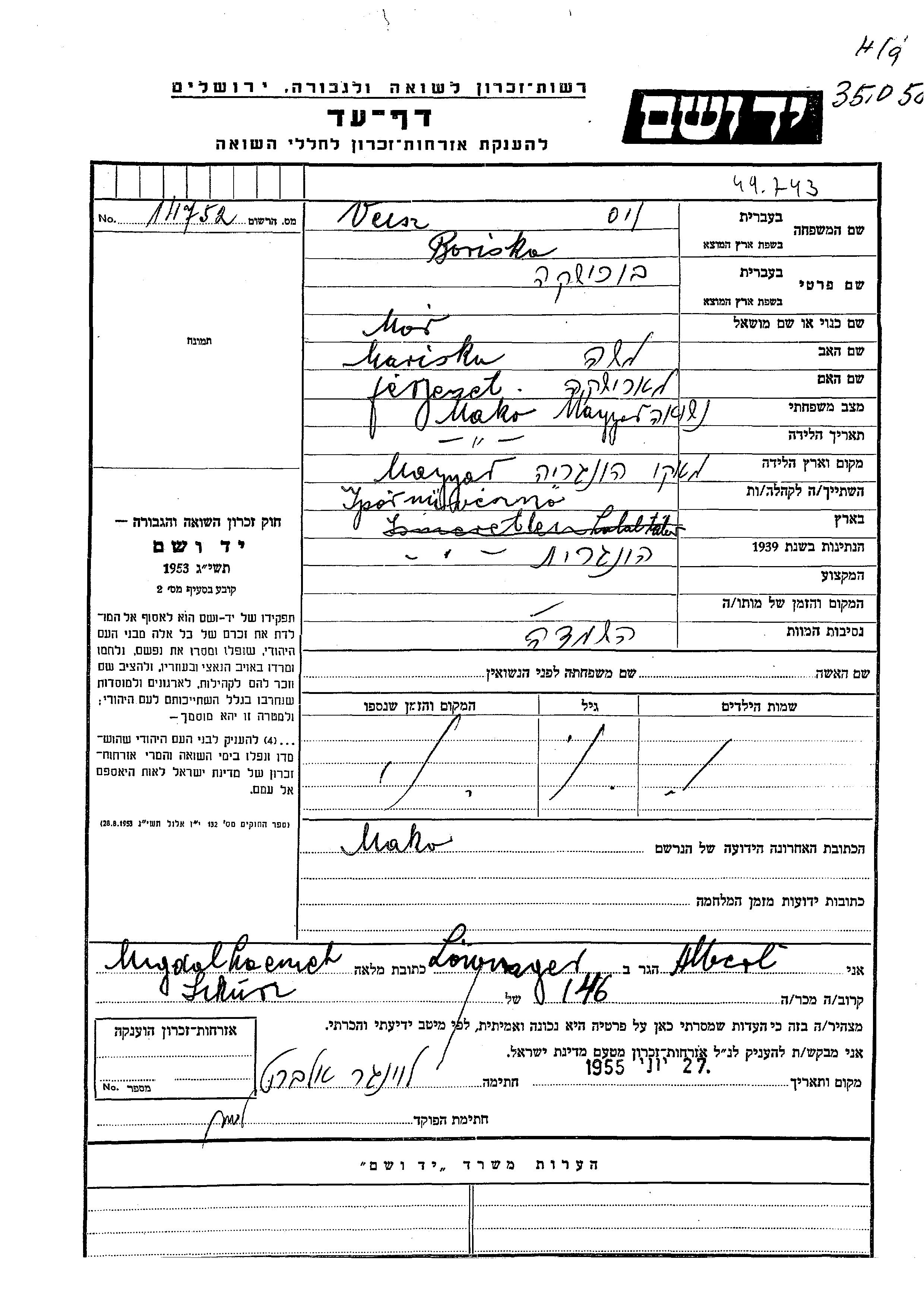 Боришка Борошка Вейсс, место рождения: Мако, Венгрия. Отец: Мор Моше, mать:Мариска. Женат / замужем. Место жительства до войны: Мако, Венгрия. Место во время войны: Мако, Венгрия.