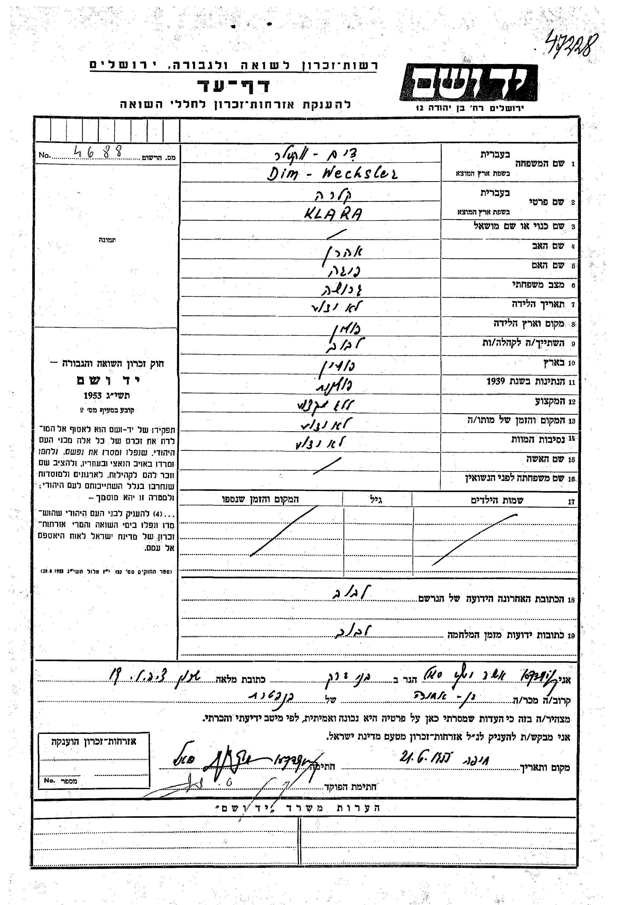 Клара Векслер Дым, девичья фамилия Векслер, место рождения: Польша. Отец: Арон, mать:Фейга. Разведен / разведена. Место жительства до войны: Львов, Польша. Место во время войны: Львов, Польша.