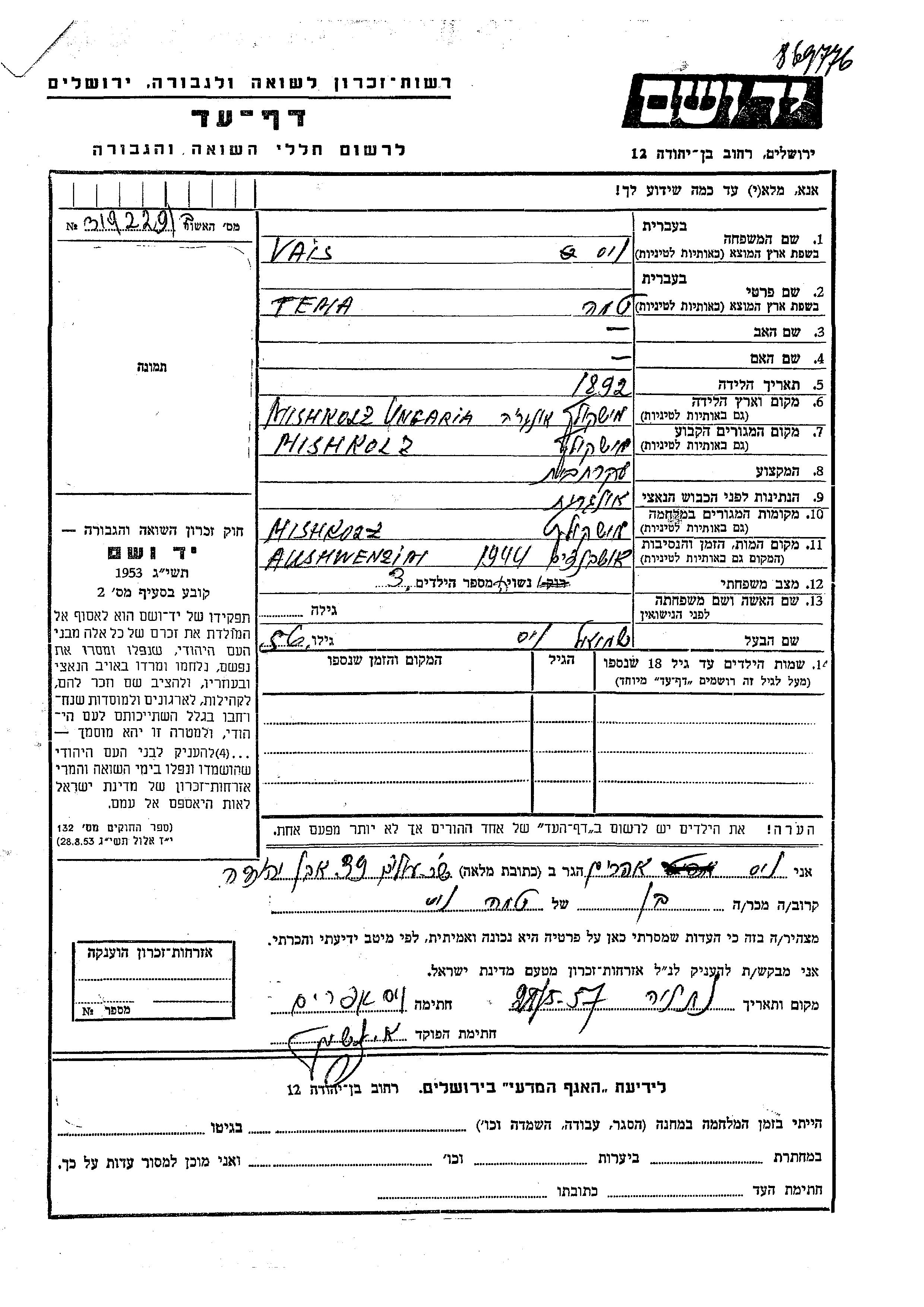 Яд Вашем - Листы свидетельских показаний Мемориального фонда