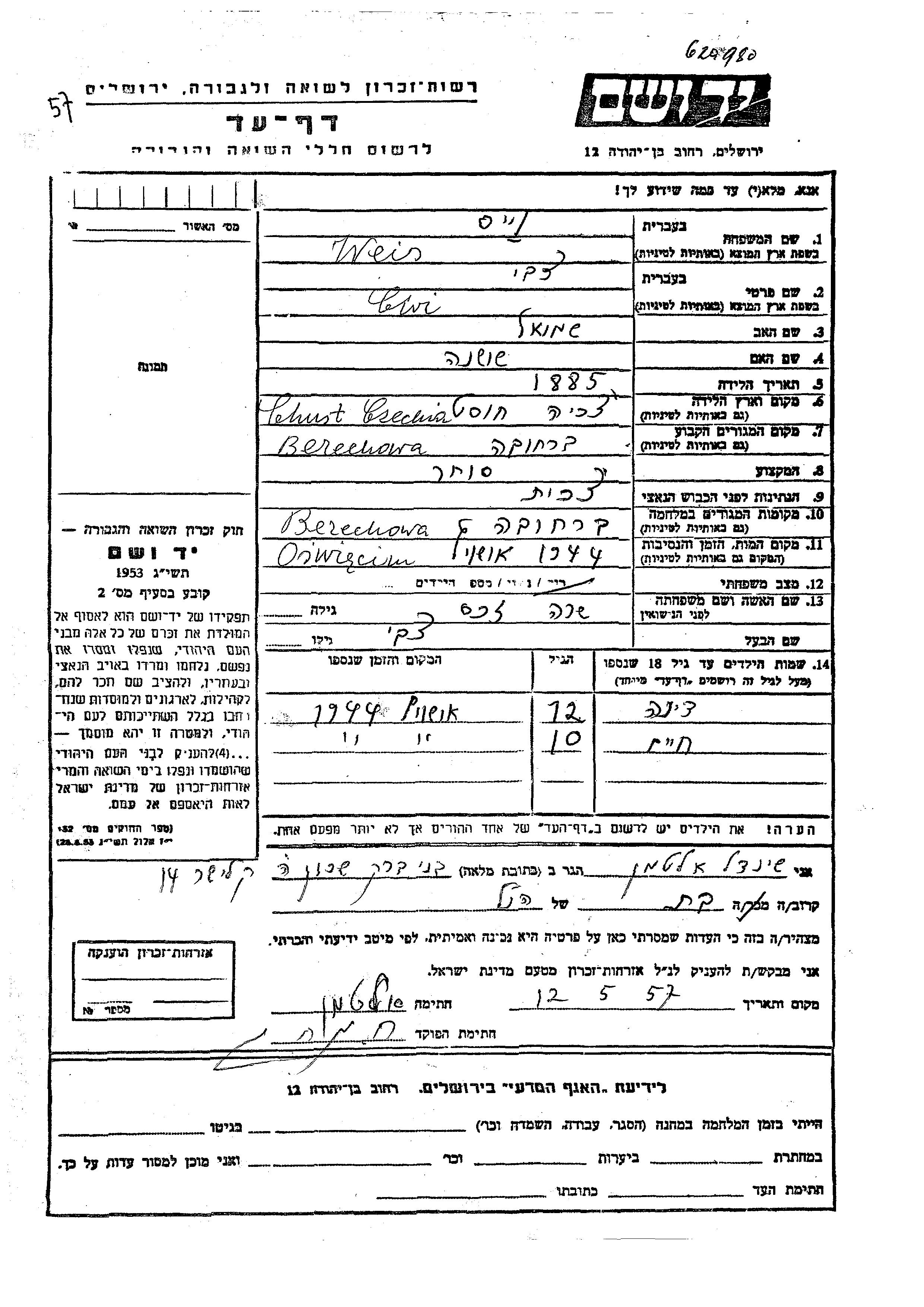 Вейс Цви 1885 Берегово, Чехословакия Лист свидетельских показаний