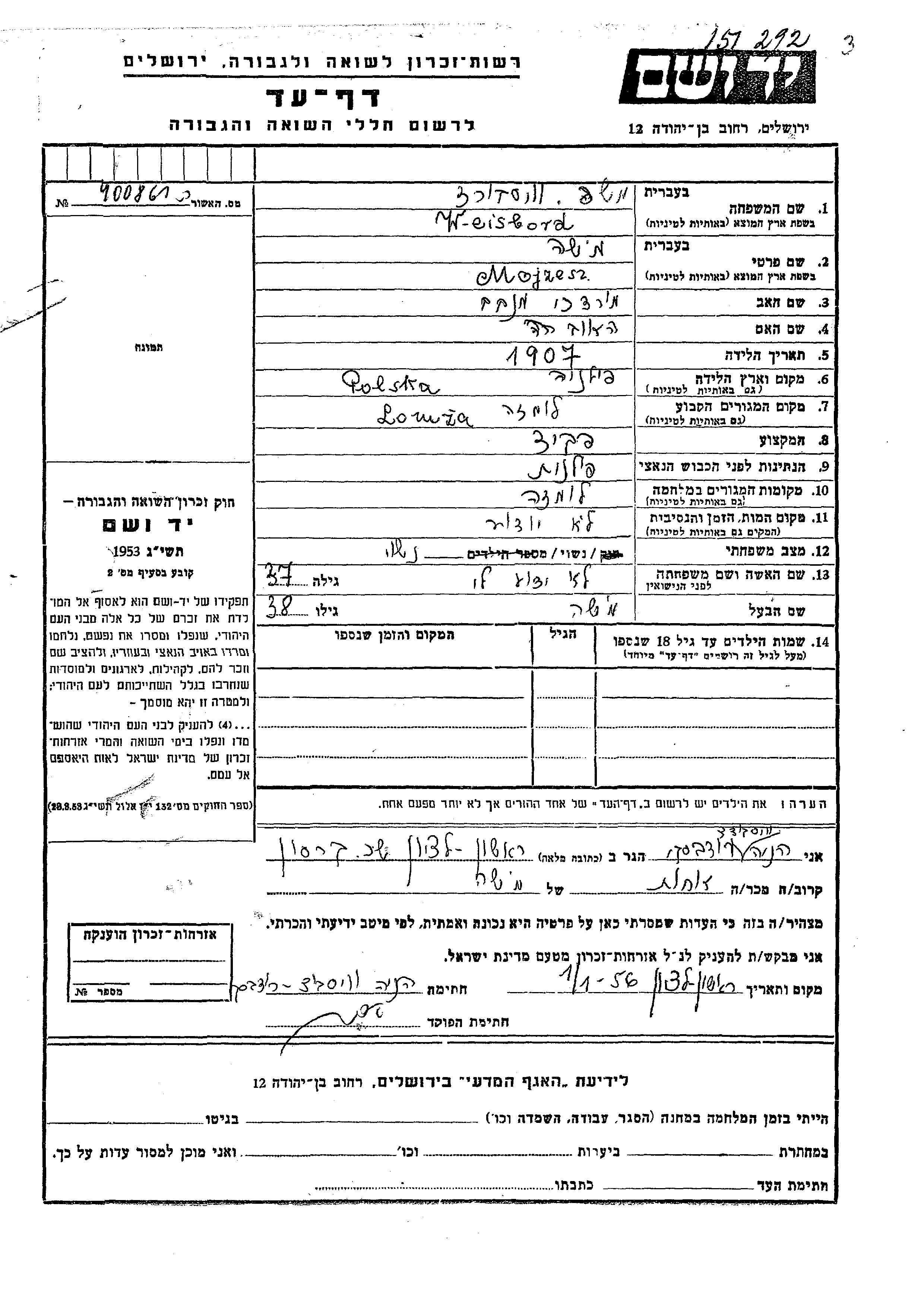 Мойжеш Миша Вайсборд, место рождения: Польша. Отец: Мордехай Менахем, mать:Ахува. Клерк. Женат / замужем. Место жительства до войны: Ломжа, Польша. Место во время войны: Ломжа, Польша.