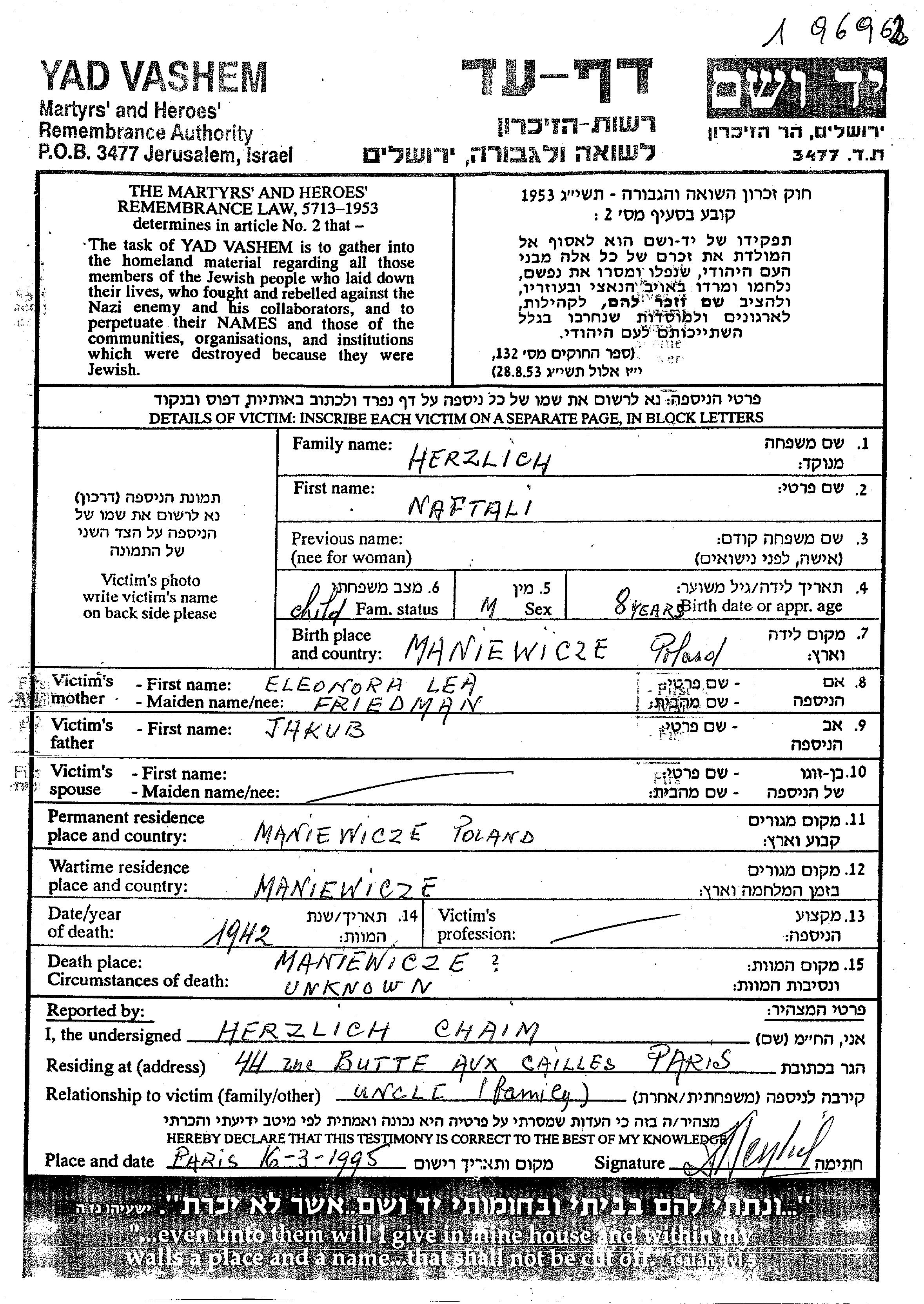 Херцлих Нафтали Маневичи, Польша Лист свидетельских показаний