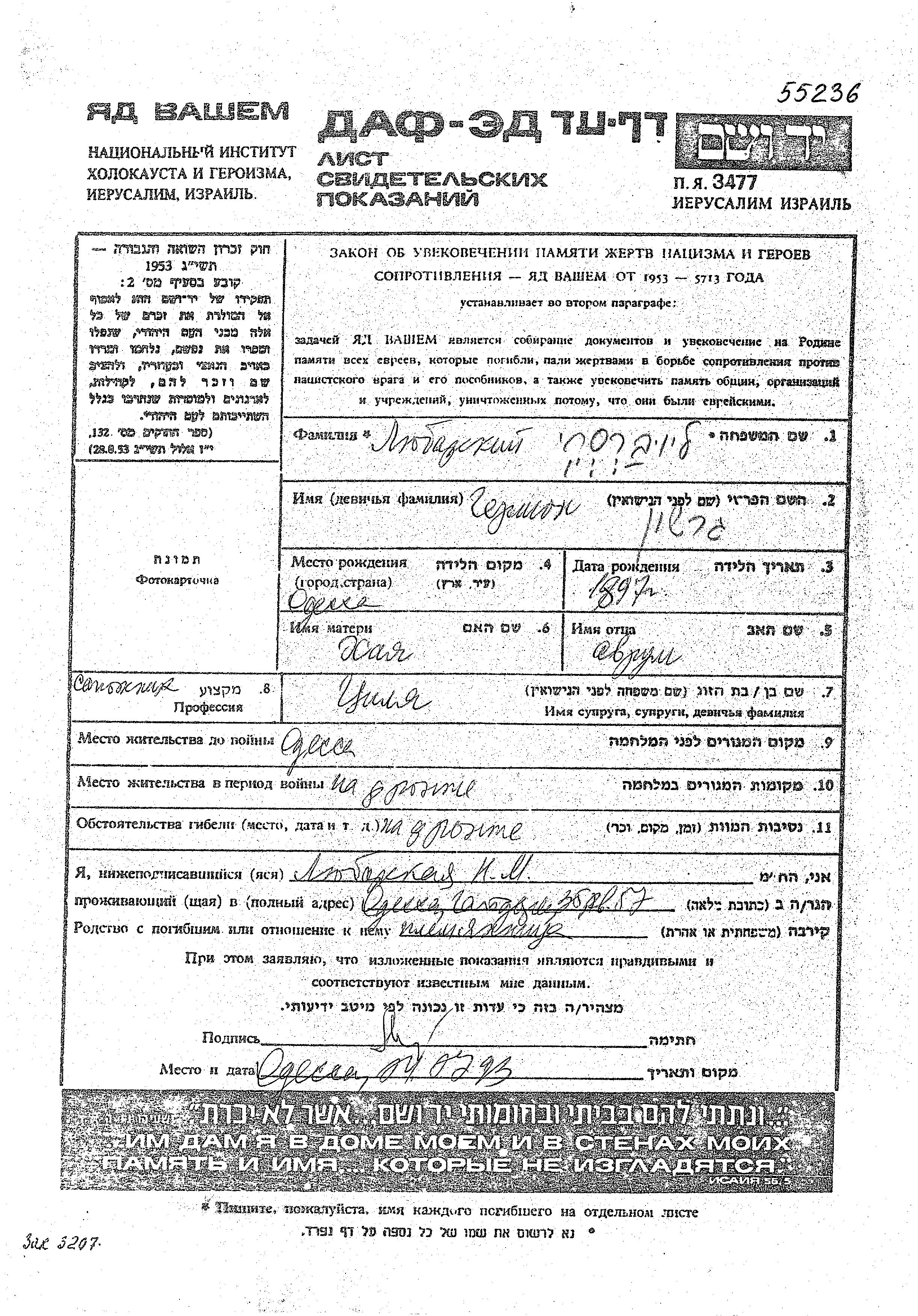 Любарски Гершон 1897 Одесса, Украина (СССР) Лист свидетельских показаний