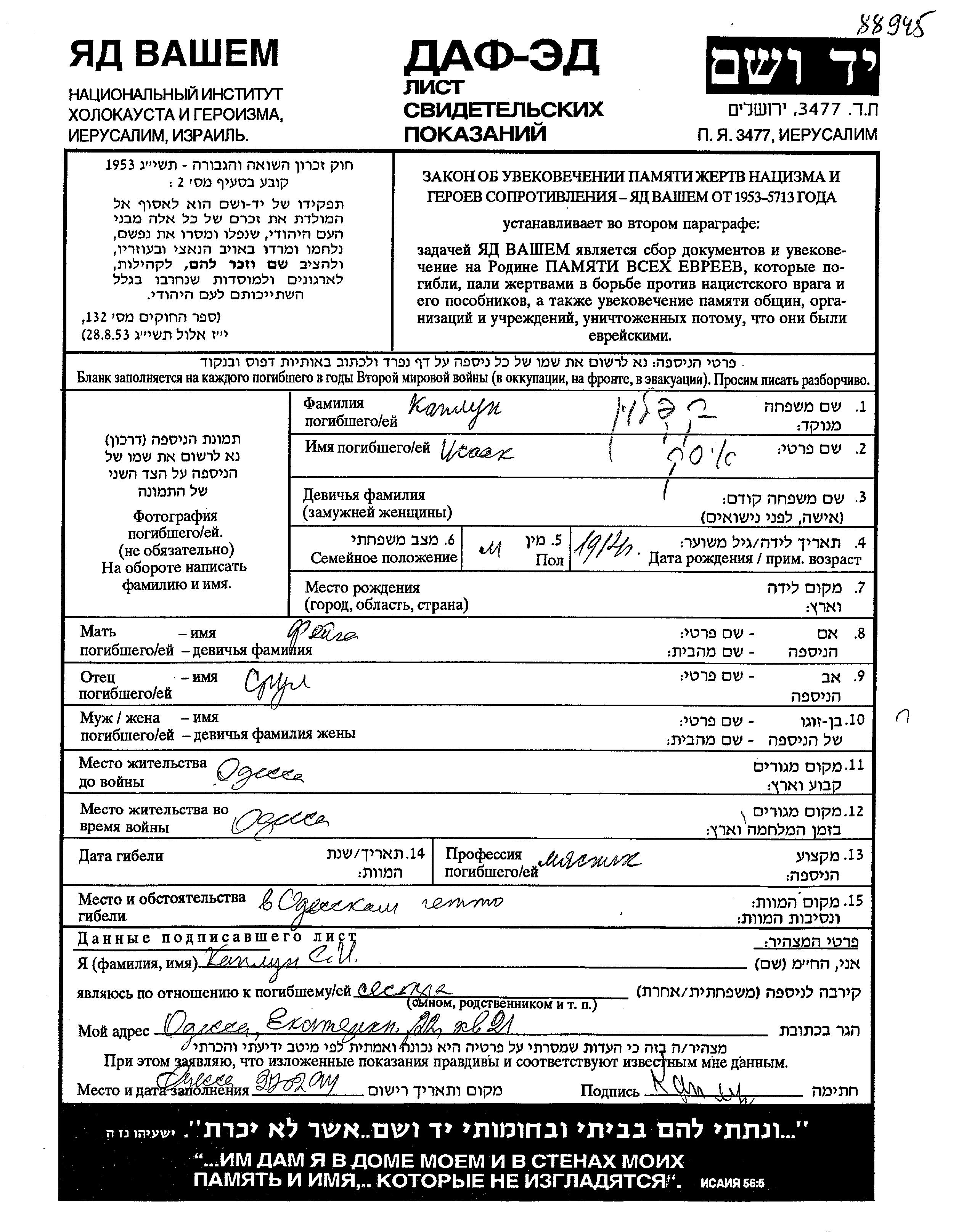 Каплун Исаак 1914 Одесса, Украина (СССР) Лист свидетельских показаний