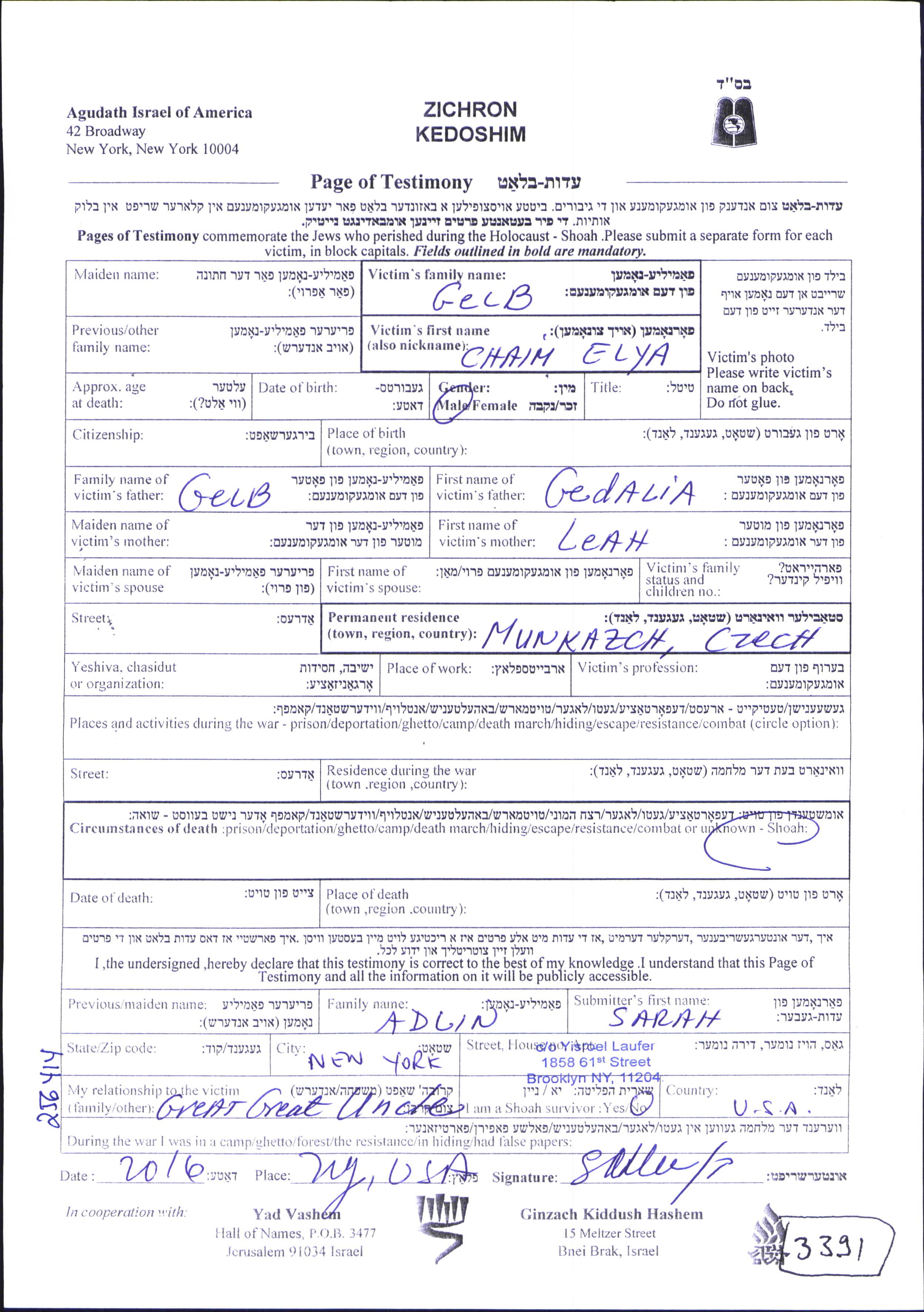 Гельб Хаим Эля Мукачево, Чехословакия Лист свидетельских показаний