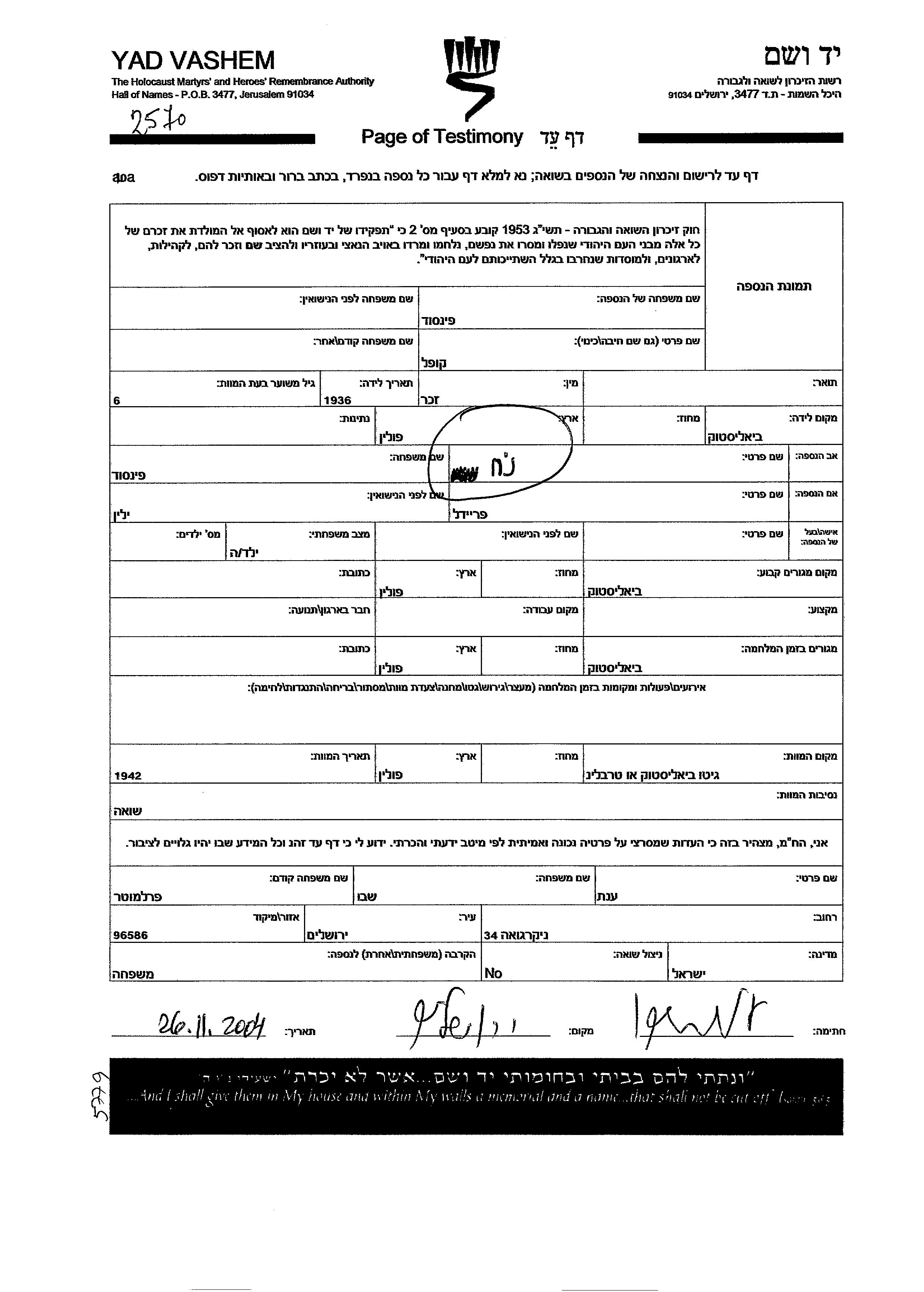 Файнсод Копель Белосток, Польша Лист свидетельских показаний