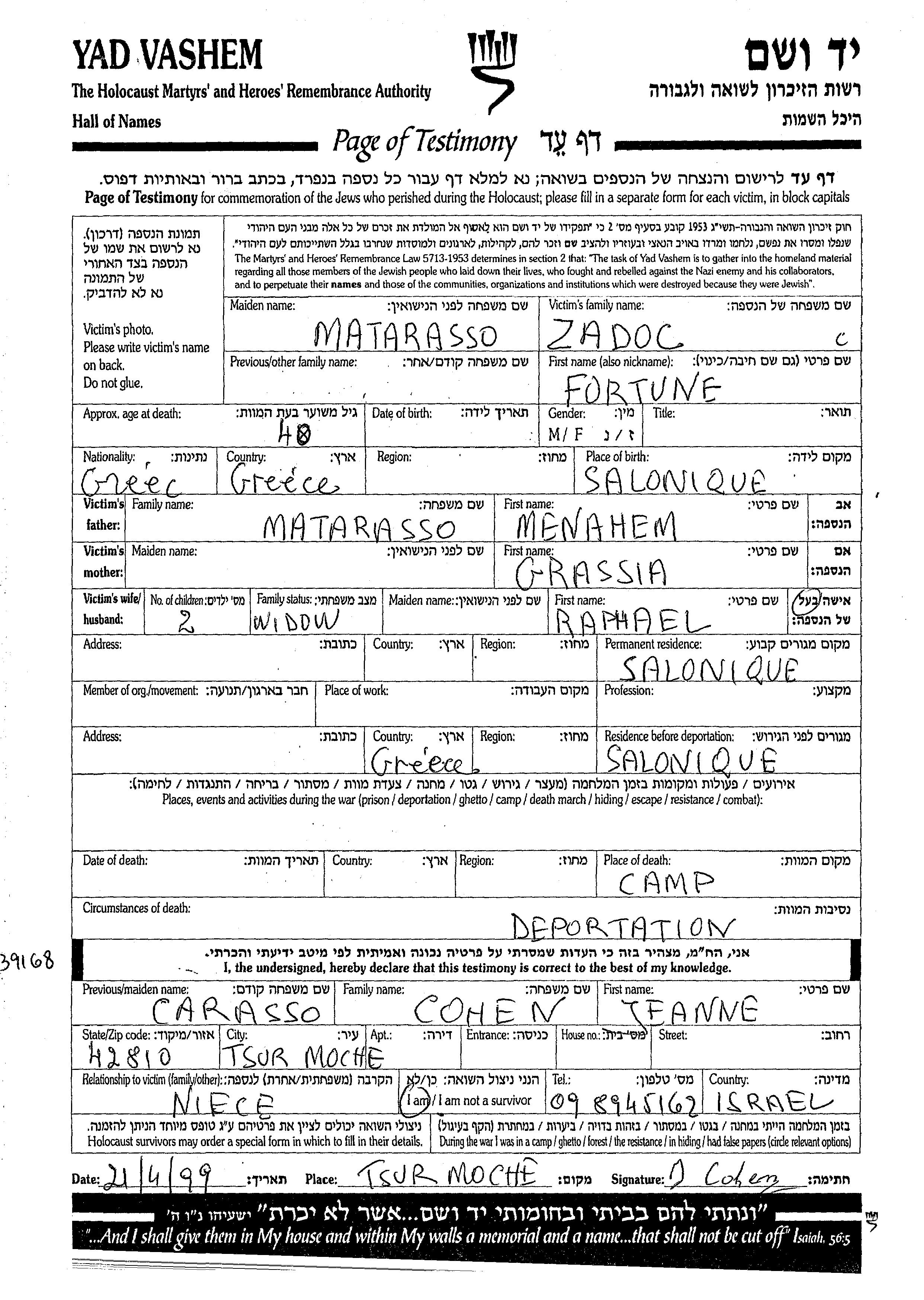 Фортуне Задок, девичья фамилия Матарассо, место рождения: Салоники, Греция. Место жительства до войны: Салоники, Греция.