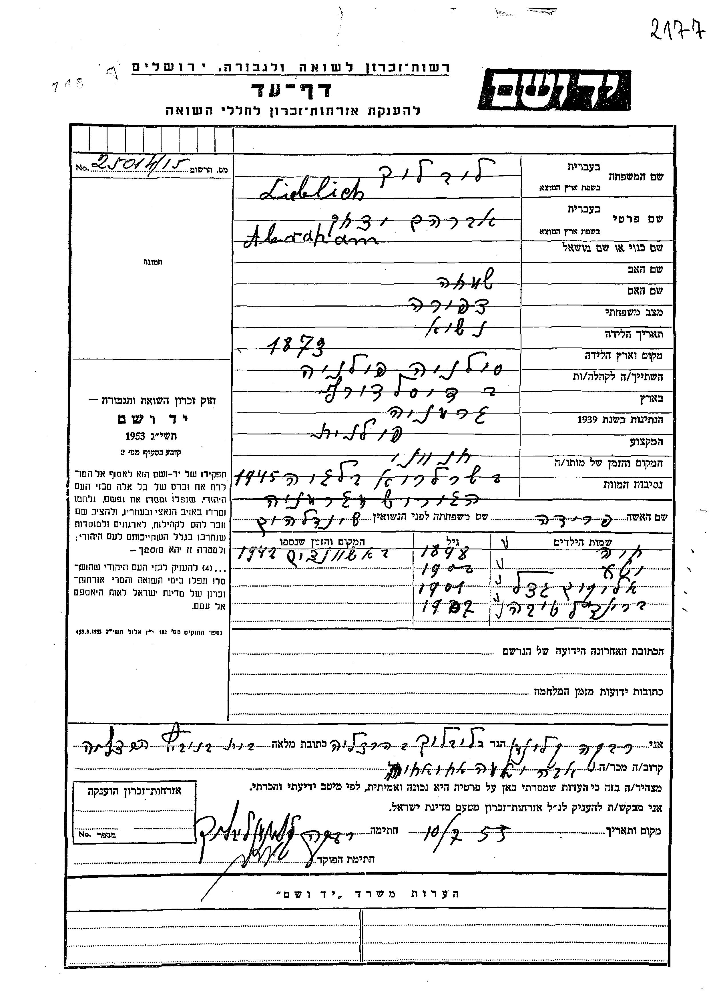 Либлих | Хая | Дюссельдорф, Германия | Лист свидетельских показаний | |