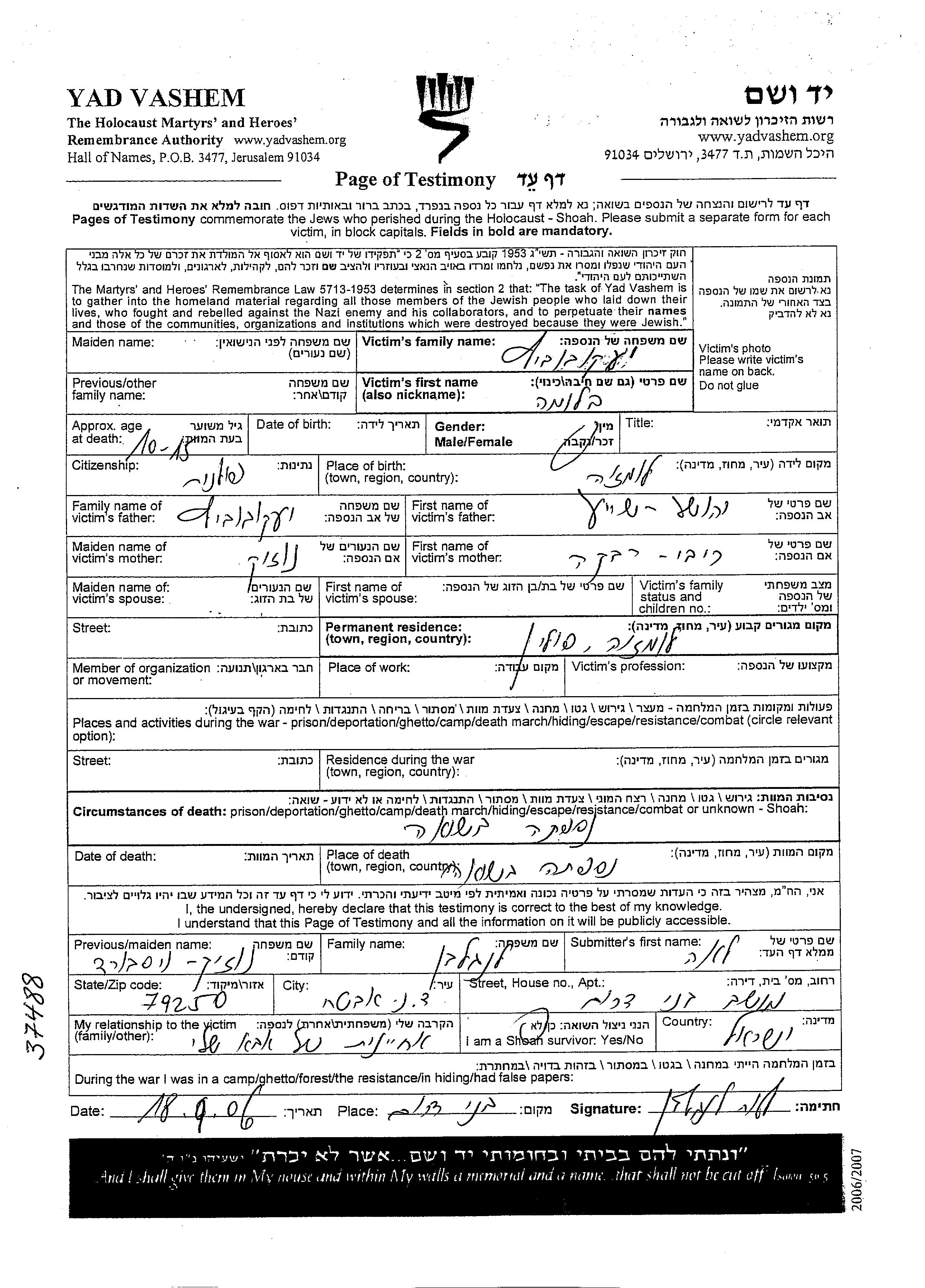 Яд Вашем - Листы свидетельских показаний Мемориального фонда