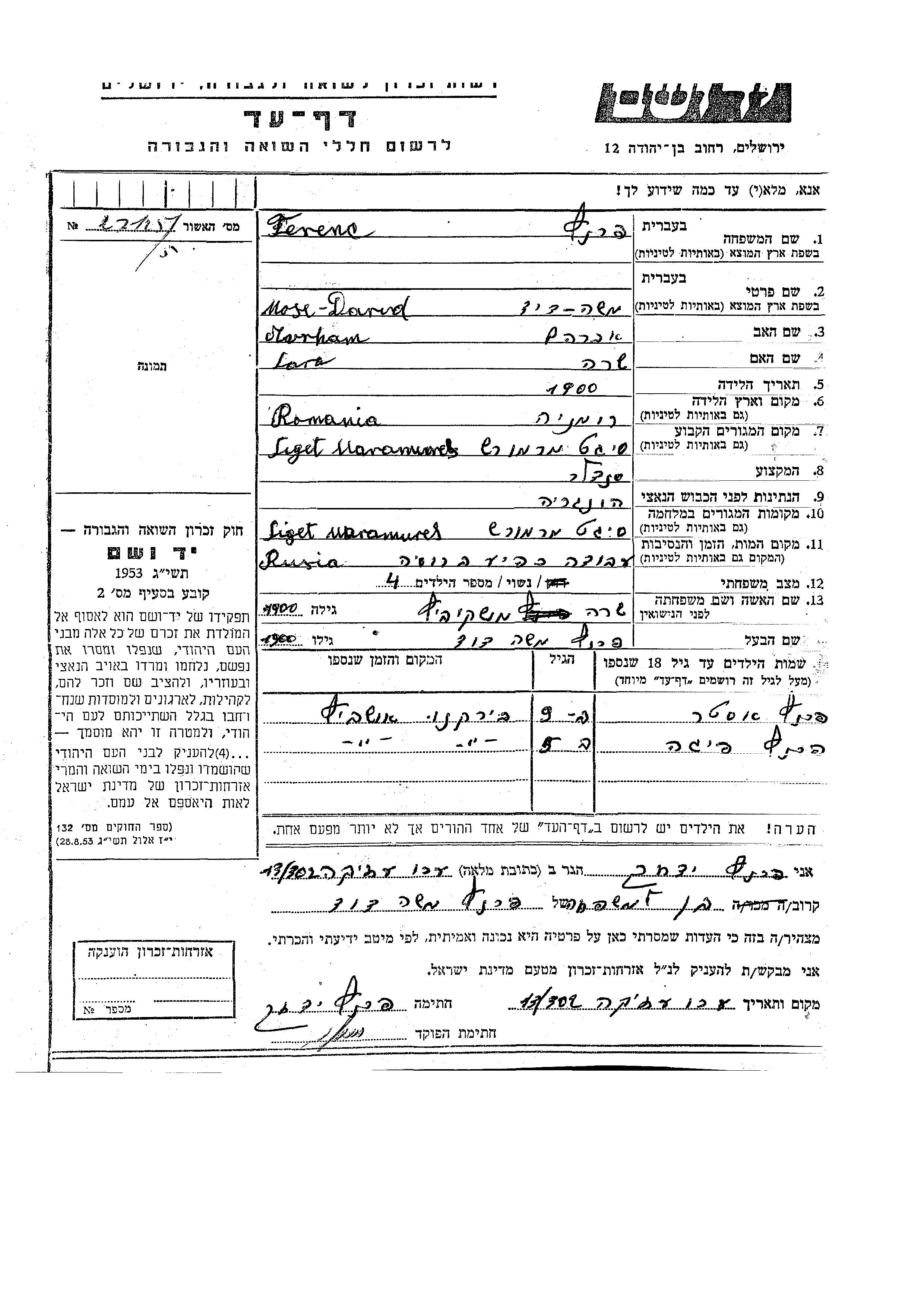 Франц | Эстер | Сигет, Румыния | Лист свидетельских показаний | |